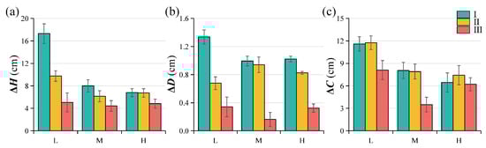 Growth of healthy M. hainanensis saplings in terms of plant (a) height (ΔH), (b) ground diameter (ΔD), and (c) crown spread (ΔC) from June 2024 to June 2025. L, M, and H indicate low, medium, and high elevations; I, II, and III correspond to canopy closure levels of 30%–50%, 50%–70%, and 70%–90%, respectively.
