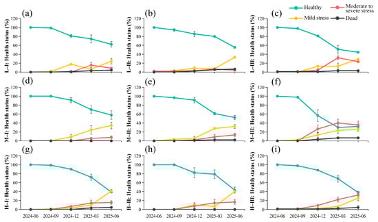 Temporal dynamics of M. hainanensis health status under different elevations and canopy closure levels. L, M, and H represent low, medium, and high elevation, respectively; I, II, and III represent canopy closure of 30%–50%, 50%–70%, and 70%–90%, respectively. The codes L-I, M-I, H-I, etc., indicate specific combinations of elevation and canopy closure treatments. (a) L-I: 400–500 m, 30%–50% canopy closure; (b) L-II: 400–500 m, 50%–70% canopy closure; (c) L-III: 400–500 m, 70%–90% canopy closure; (d) M-I: 600–700 m, 30%–50% canopy closure; (e) M-II: 600–700 m, 50%–70% canopy closure; (f) M-III: 600–700 m, 70%–90% canopy closure; (g) H-I: 900–1000 m, 30%–50% canopy closure; (h) H-II: 900–1000 m, 50%–70% canopy closure; (i) H-III: 900–1000 m, 70%–90% canopy closure.