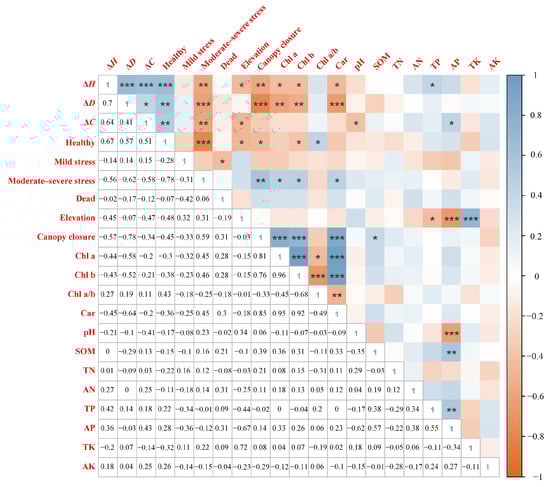 Heatmap of correlations between growth and health indicators of M. hainanensis and environmental factors. ΔH, ΔD, and ΔC represent increases in plant height, ground diameter, and crown spread, respectively; Chl a, Chl b, and Car represent chlorophyll a, chlorophyll b, and carotenoids, respectively; SOM, TN, AN, TP, AP, TK, and AK represent soil organic matter, total nitrogen, alkali-hydrolyzable nitrogen, total phosphorus, available phosphorus, total potassium, and available potassium, respectively. Color intensity indicates the strength of correlation. * indicates significance at p < 0.05, ** at p < 0.01, and *** at p < 0.001.