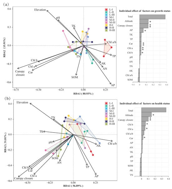 Redundancy analysis (RDA) of environmental factors with (a) growth indices and (b) health status of M. hainanensis. The left panels show the RDA ordination plots, illustrating the distribution of plots and response variables along environmental gradients; the right panels display bar plots of the explanatory contribution of each environmental factor to the response variables (* indicates significance at p < 0.05, and ** at p < 0.01). (a) Response variables: height increment (ΔH), diameter increment (ΔD), and crown spread increment (ΔC). (b) Response variables: proportion of Healthy, Mild stress, Moderate–severe stress, and Dead. Explanatory variables: Elevation, Canopy closure, chlorophyll a (Chl a), chloro-phyll b (Chl b), carotenoids (Car), soil organic matter (SOM), total nitrogen (TN), alka-line hydrolyzable nitrogen (AN), total phosphorus (TP), available phosphorus (AP), total potassium (TK), and available potassium (AK).Plot codes (L-I, M-I, H-I, etc.) indicate different combinations of elevation and canopy closure treatments.