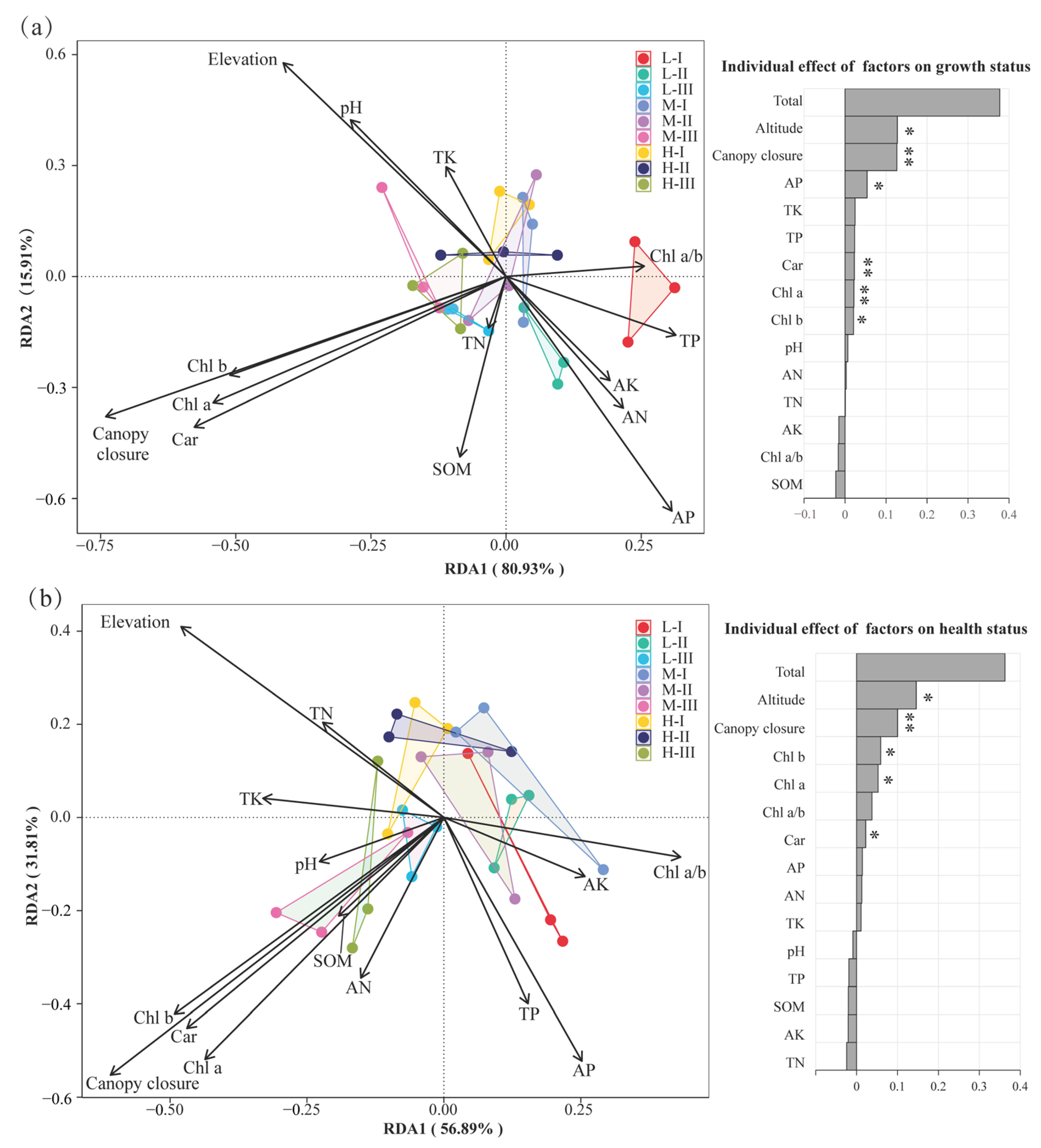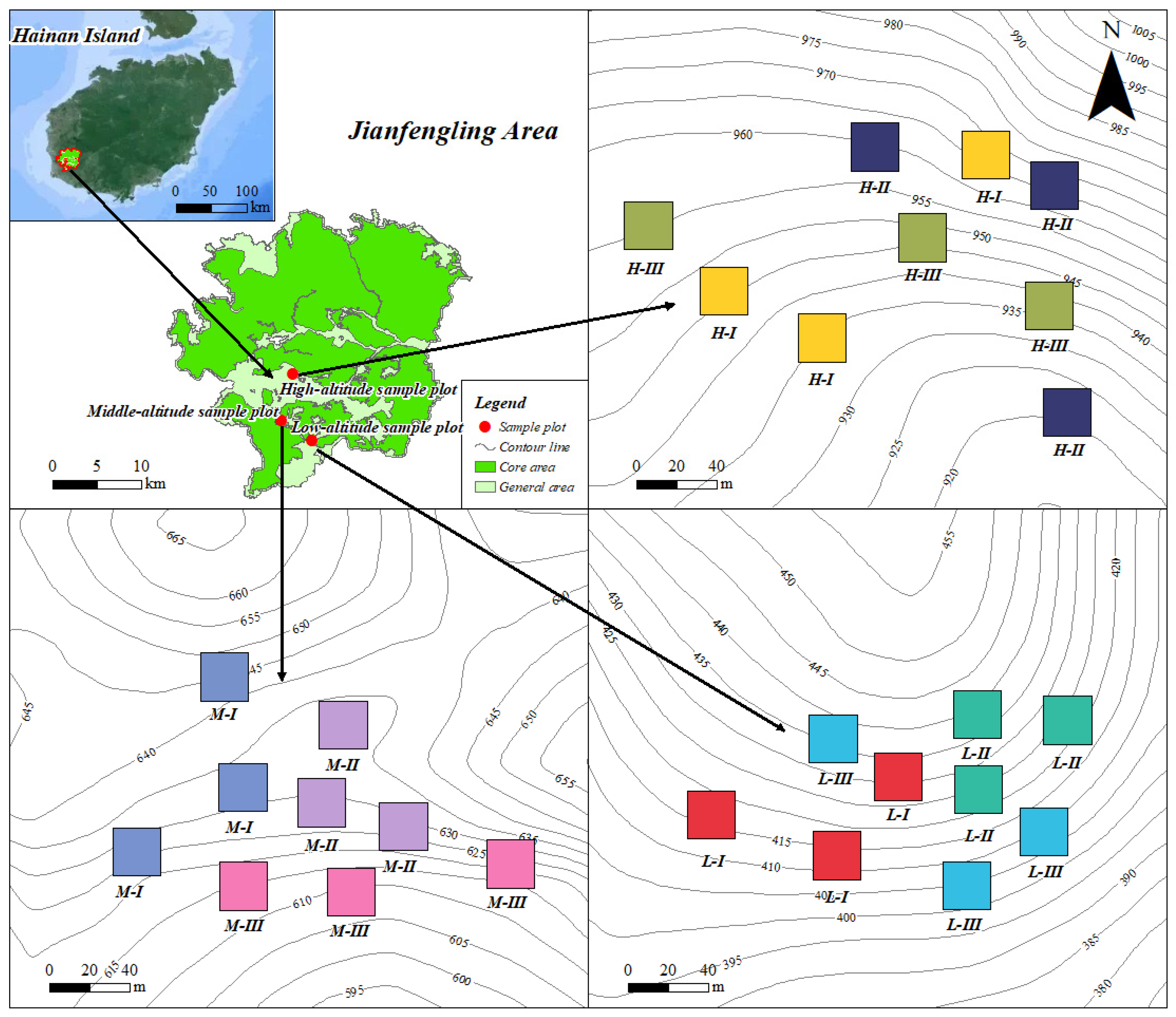 4.1. Response of M. hainanensis Growth to Elevation and Canopy Closure Gradients
