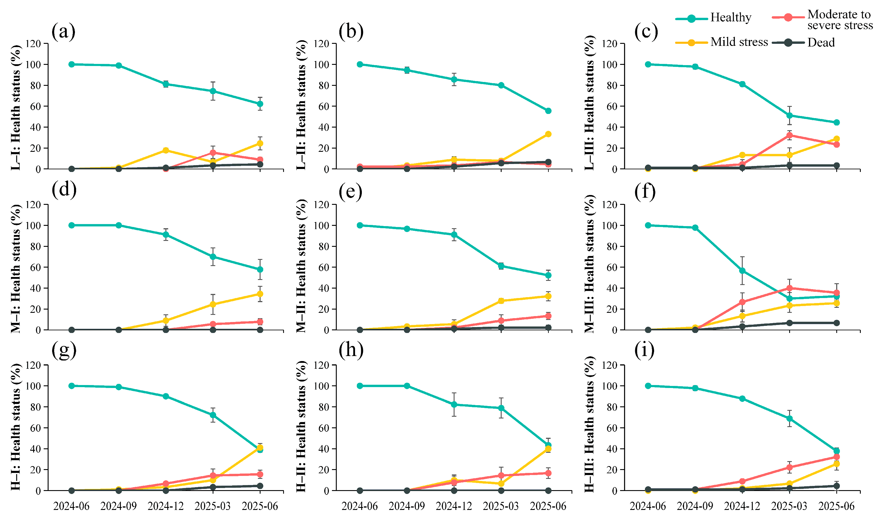 - Sapling health exhibited a continuous decline throughout the monitoring period. The proportion of healthy individuals significantly decreased in high-elevation and high-canopy-closure plots, while the proportions of mild and moderate–severe stress individuals increased markedly. Multiple regression analysis indicated that canopy closure exerted a stronger negative influence on health than elevation, with a significant interaction between the two factors amplifying physiological stress.
