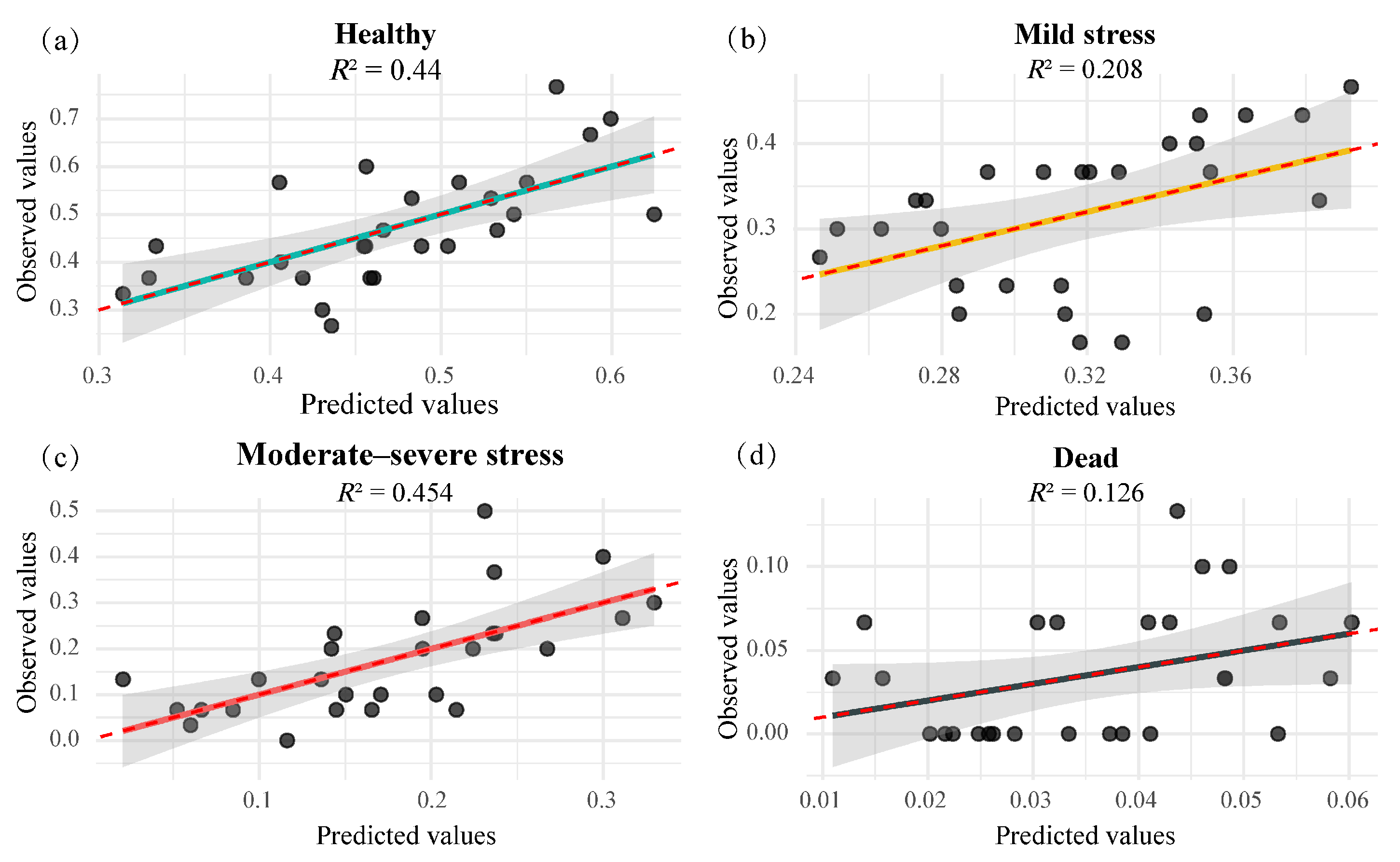 | Mild stress | (Intercept) | −0.0389 | 0.1834 | −0.212 | 0.834 |