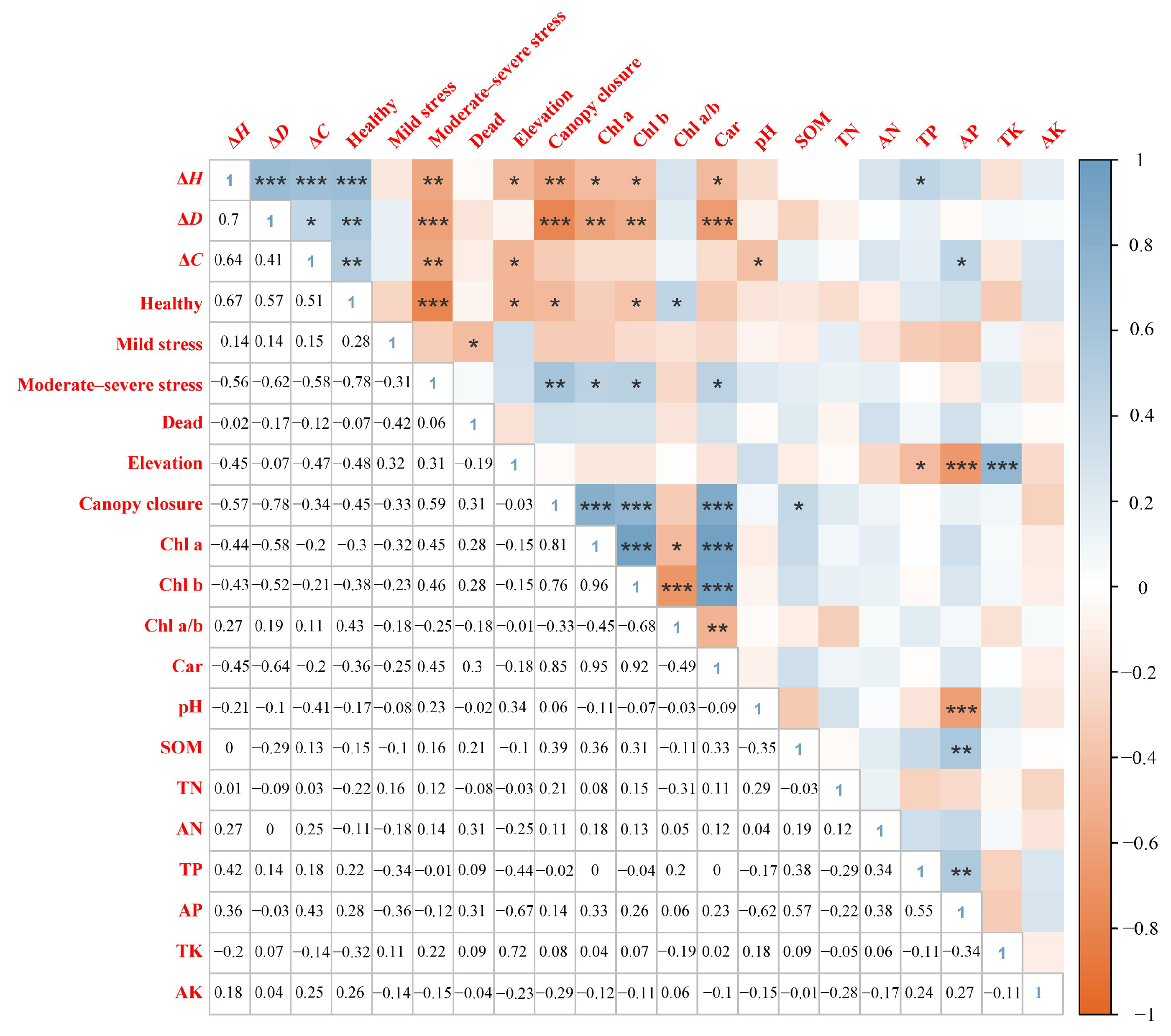 - Photosynthetic pigment content increased significantly under high canopy closure, reflecting a degree of light-adaptive adjustment. However, this compensatory response was insufficient to mitigate growth inhibition under low-light conditions. SOM and AP promoted sapling growth, whereas pH and AK exhibited no significant effects. These findings suggest that, in tropical lowland rainforests, light limitation plays a more critical role than nutrient limitation in regulating early sapling growth.