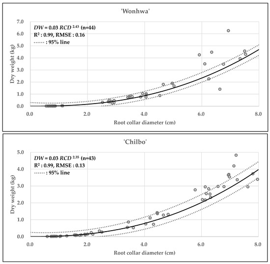 To quantitatively validate the model selection, we compared the fit statistics (R2, RMSE, AIC, BIC) of various candidate models using RCD, H, and CW as single or combined predictors (Table 6 and Table 7). The analysis confirmed that RCD-based power models consistently provided the most reliable single-variable predictions. For instance, in ‘Wonhwa’, the RCD power model achieved an R2 of 0.86, showing significantly higher values than the best Height-based model (R2 = 0.38). Similarly, for ‘Chilbo’, the RCD model (R2 = 0.91) demonstrated superior explanatory power compared to Height (R2 = 0.58) and Crown Width (R2 = 0.85). Although multi-variable models (e.g., combining RCD, H, and CW) yielded marginal improvements in R2, the single-variable RCD model was selected as the final estimator.