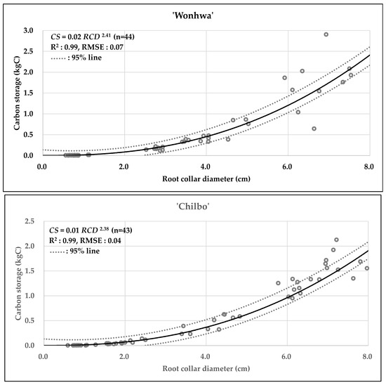 Scatter plots of carbon storage (kgC) as a function of root collar diameter (cm) for Hibiscus syriacus ‘Wonhwa’, and ‘Chilbo’. Circles indicate observed data. The solid lines represent the fitted allometric equation models, and the dashed lines indicate the 95% confidence intervals for each model.