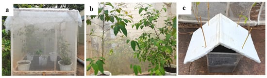 Adult scarab beetles were reared outdoors starting from late May at the Institute of Highland Forest Science, Chinese Academy of Forestry, located in Kunming. During the local summer in June, the average daily low temperature was 16 °C, while the average daily high temperature reached 25 °C. The monthly rainfall totaled 553 mm, and 23 days with precipitation [13]. Adults were reared in an outdoor nylon mesh chamber measuring 1.25 × 1.25 × 1.5 m in length, width, and height, with a 10 cm layer of sieved fine soil. Potted plants, including E. urophylla × E. grandis (DH3229), E. grandis × E. urophylla (GL9), B. alnoides, A. adenophora, and R. pectinellus collected from the wild understory were placed in the net cage (Figure 2a,b). Three pairs of adult males and females were selected from those collected from damaged roots and placed in 20 × 20 × 25 cm rearing containers. The containers were filled to half the volume with sieved moist soil. To prevent excessive rainfall in May and June from affecting the rearing of scarab beetles, a simple homemade rain-proof device made of plastic foam boards was constructed (Figure 2c). The rearing container was placed inside the nylon mesh cage. Three independent mesh cages were set up, each containing the same number of beetles and host plants. Inspections were conducted every two days to check for adult insects laying eggs. The eggs were collected and placed in a 12 × 12 × 7.5 cm rearing container for observation. Weekly checks were conducted to monitor egg hatching and larval development. Dead larvae and adults were immersed in 75% ethanol for microscopic examination. Two months after the adults died out, the soil in potted plants and mesh cages was inspected for the larvae.