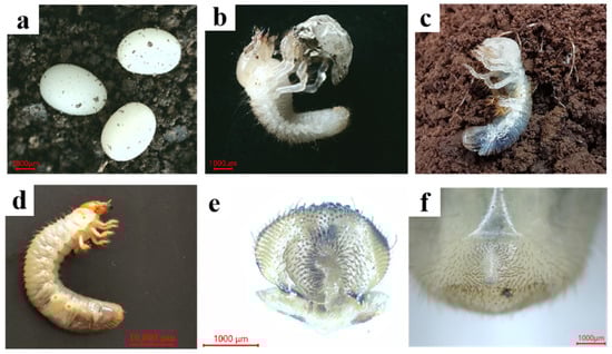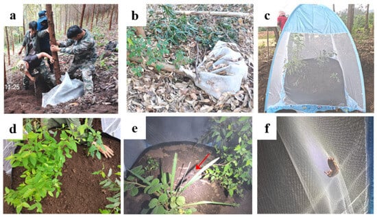 During the adult stage in May, dead branches and fallen leaves in open areas within the Eucalyptus stands were cleared away, and the ground was leveled. An enclosed-net chamber was constructed using a Mongolian yurt mosquito net with dimensions of 2 × 1.8 × 1.5 m, with fully enclosed at the base and a T-shaped door. A non-woven fabric planting bag (1.28 m in diameter and 30 cm in height) was placed inside the net chamber. The bag was filled to two-thirds of its capacity with sifted soil to ensure that no other insects were present. Seedlings of several species, such as E. grandis × E. urophylla (GL9), B. alnoides, A. adenophora, R. pectinellus, and pre-cultivated peanut (Arachis hypogaea), were planted in the soil. These plants served as oviposition hosts, feeding sources and mimic natural understory vegetation. Ten adults, including two female adults previously collected from the damaged roots in the net bags, were introduced into the chamber. Additionally, 10 adults of the same species, collected via ultraviolet lamps at dusk, were added to the chamber. Observations of adult activities were initiated at 8:00 PM, and their mating behavior was confirmed (Figure 3c–f). This process was repeated in June. Two field net chambers were constructed at the LBD site. Monthly soil inspections were conducted to monitor the development of eggs and larvae.