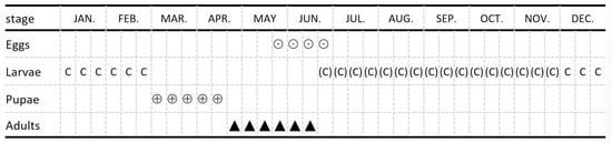 Occurrence and damage history of M. grandicornis in Eucalyptus plantations. (Key: ⊙: Egg; C: Larvae; (C): Damage-stage larvae; ⊕: Pupae; ▲: Adult.).
