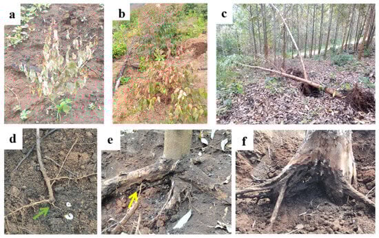 Damaged features of M. grandicornis larvae on Eucalyptus plants. (a): 2-month-old plants showing wilting; (b): 6-month-old plant showing discoloration and wilting; (c): collapsed damaged plants in 2-year-old stands; (d): the chewed taproots of the two-month-old tree (indicated by green arrow); (e): gnawed lateral roots of standing tree (indicated by yellow arrow); (f): severely gnawed stump.