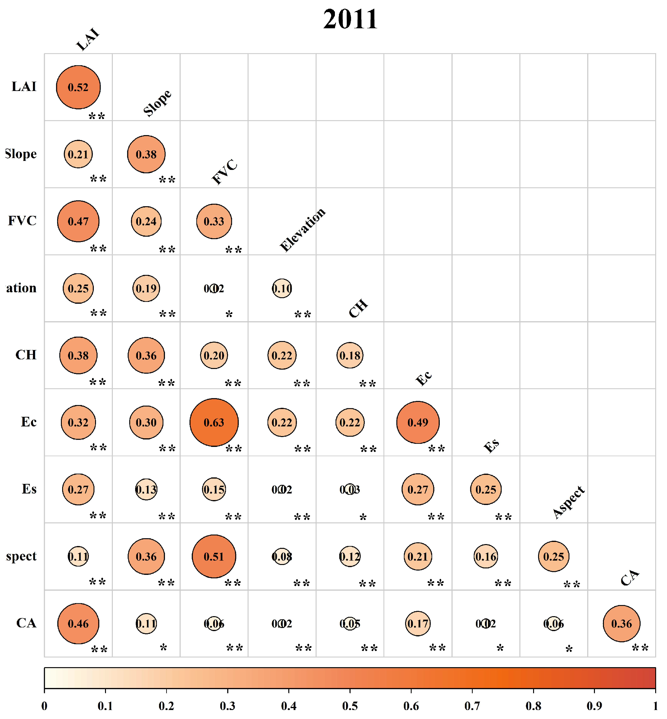 3.3. Analysis of the Factors Influencing the Spatial Variation in Cooling Effect