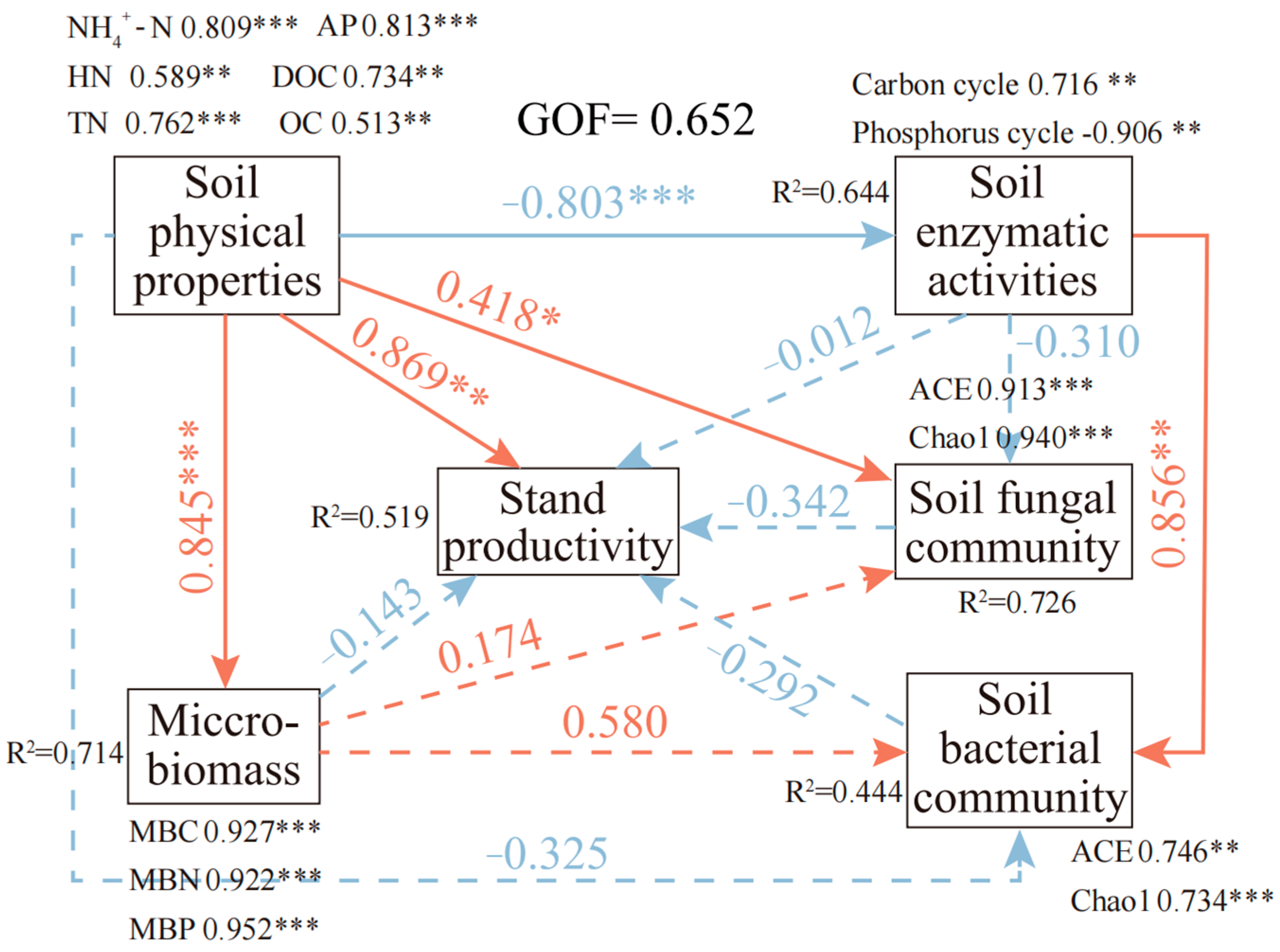 - Productivity is regulated by a multi-pathway network: soil properties govern productivity through a complex network involving both direct effects and indirect pathways mediated by microbial communities and enzyme activities.