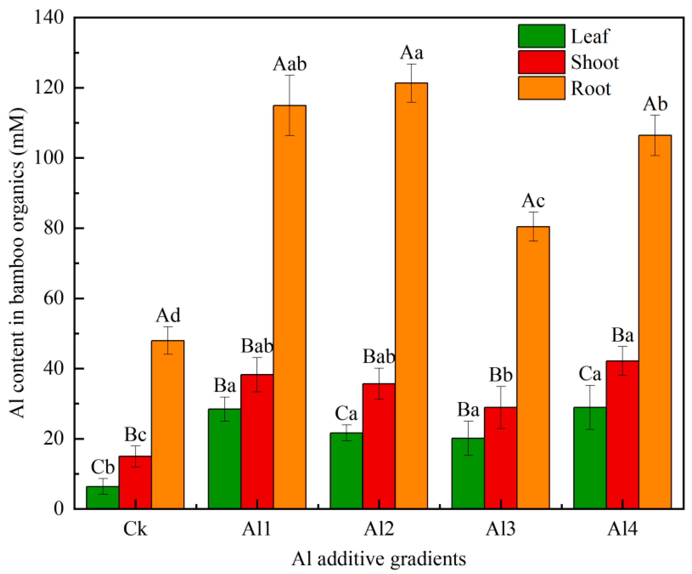 3.1. Comparison of Aluminum Content in P. edulis Seedlings Among Treatments