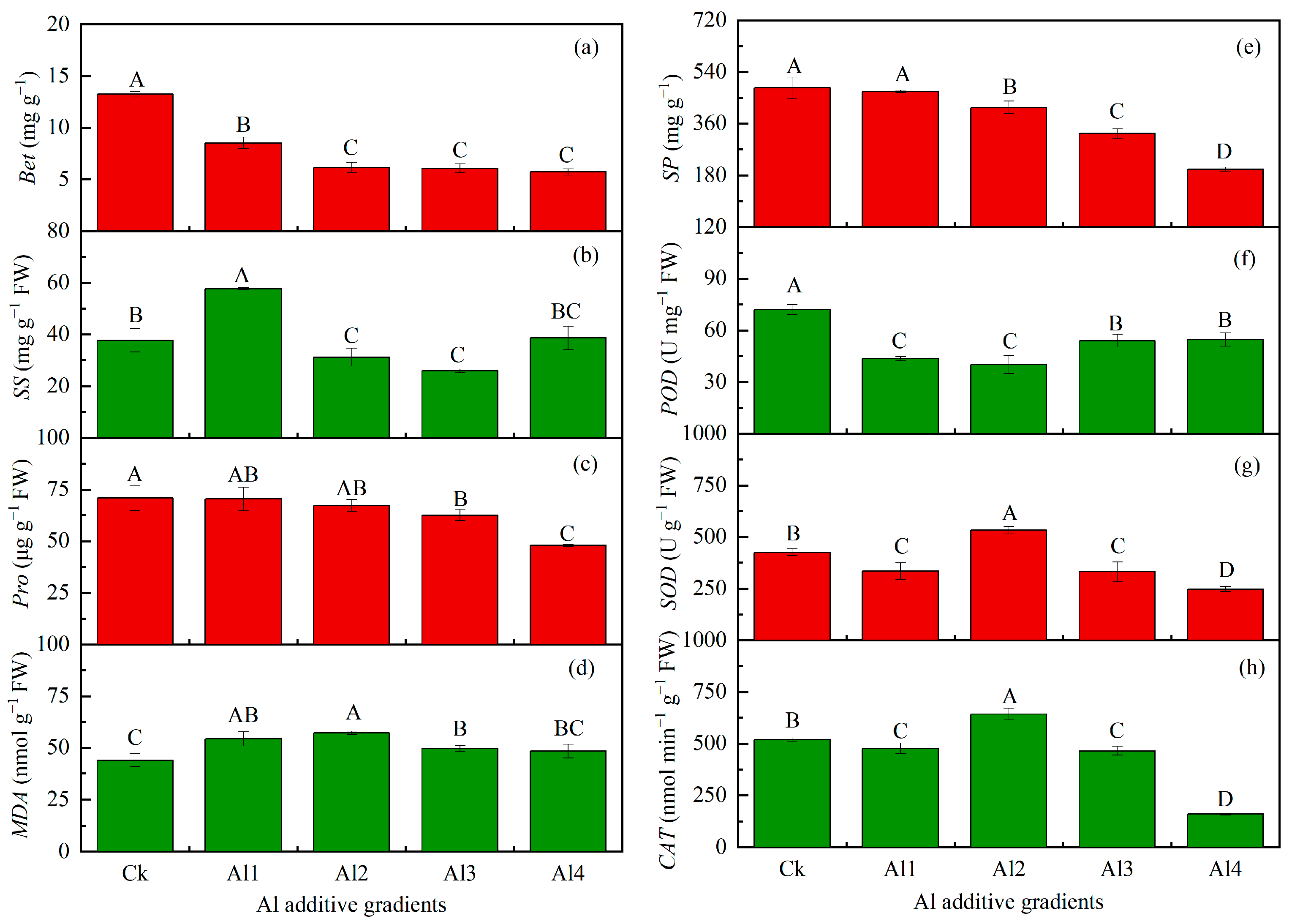 - Peng, Y.; Li, Y.; Yang, G.; He, G. Effects of aluminum stress on the activities of SOD, POD, CAT and the contents of MDA in the seedlings of different wheat cultivars. Biotechnology 2006, 16, 38–42. [Google Scholar] [CrossRef]