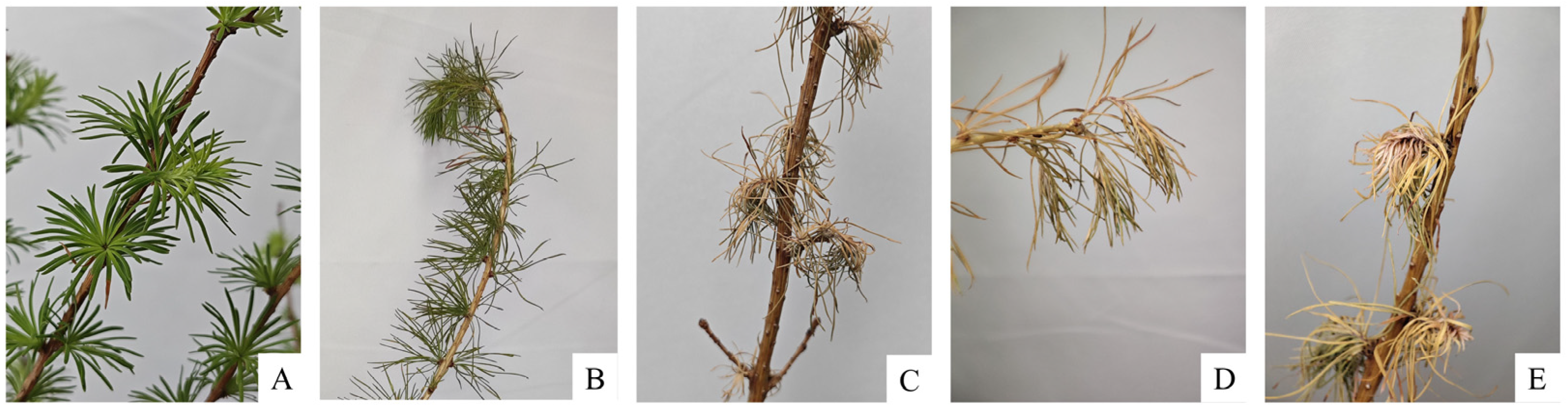 - Li, D.; Wang, W.; Li, Z.; Tian, C.; Yu, Y.; Jiang, S. Preliminary study on the pathogenicity of pine wood nematode to Pinus koraiensis, Pinus tabulaeformis and Larix kaempferi seedlings. China For. Dis. Insect Pests 2025, 44, 23–28. [Google Scholar]