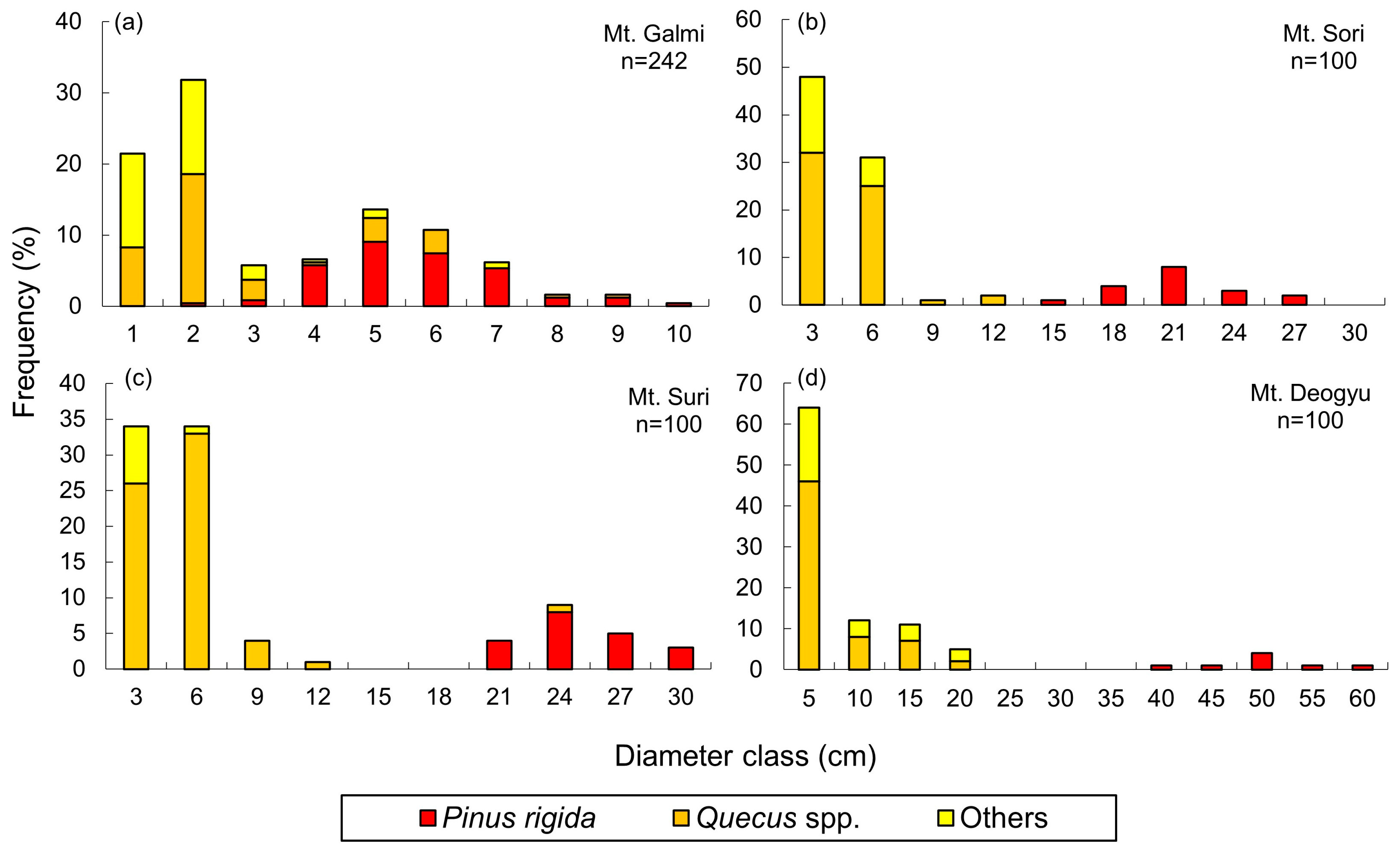 | Mt. Deogyu | 76 | S | 713 | 20 | 11.6 | 1105.3 | Granite | Brown forest |