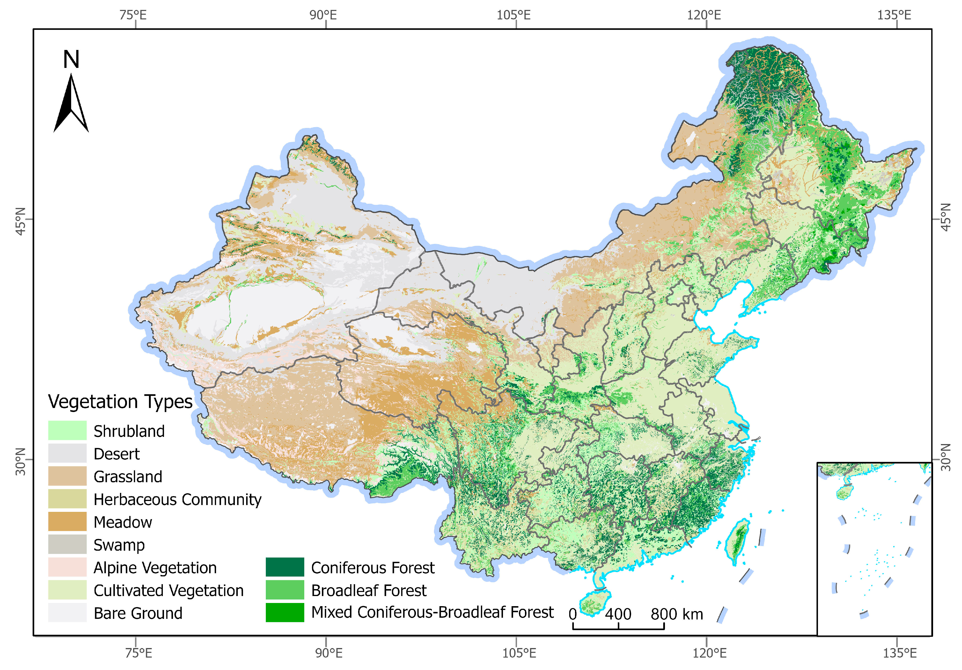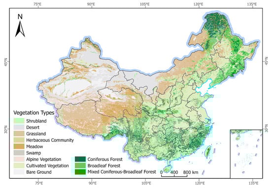 This study centers on China, characterized by its extensive landmass, highly varied terrain, and pronounced climatic and vegetation heterogeneity. Figure 1 shows that China’s forests are chiefly distributed across three major regions: the northeast, the south, and the southwest. These areas not only have high vegetation cover and rich biomass but also experience frequent summer thunderstorms, creating both climatic and fuel conditions for lightning-caused fires. According to wildfire statistics from the China Meteorological Administration and the National Forestry and Grassland Administration, lightning has become one of the major triggers of summer wildfires in some forested regions of China. This is particularly evident in lightning prone areas such as the Daxing’an Mountains in Heilongjiang [17]. Moreover, under the influence of global warming, extreme weather events such as heatwaves, droughts, and thunderstorms have shown a significant upward trend in China [18]. The China Climate Change Blue Book (2023) reports that over the past two decades, the annual number of hot days has increased markedly nationwide, while thunderstorm frequency and intensity have risen simultaneously in southern and southwestern regions, intensifying the potential risk of lightning-caused fires. Therefore, studying the relationship between extreme climate and lightning fires in this region is of great scientific significance.