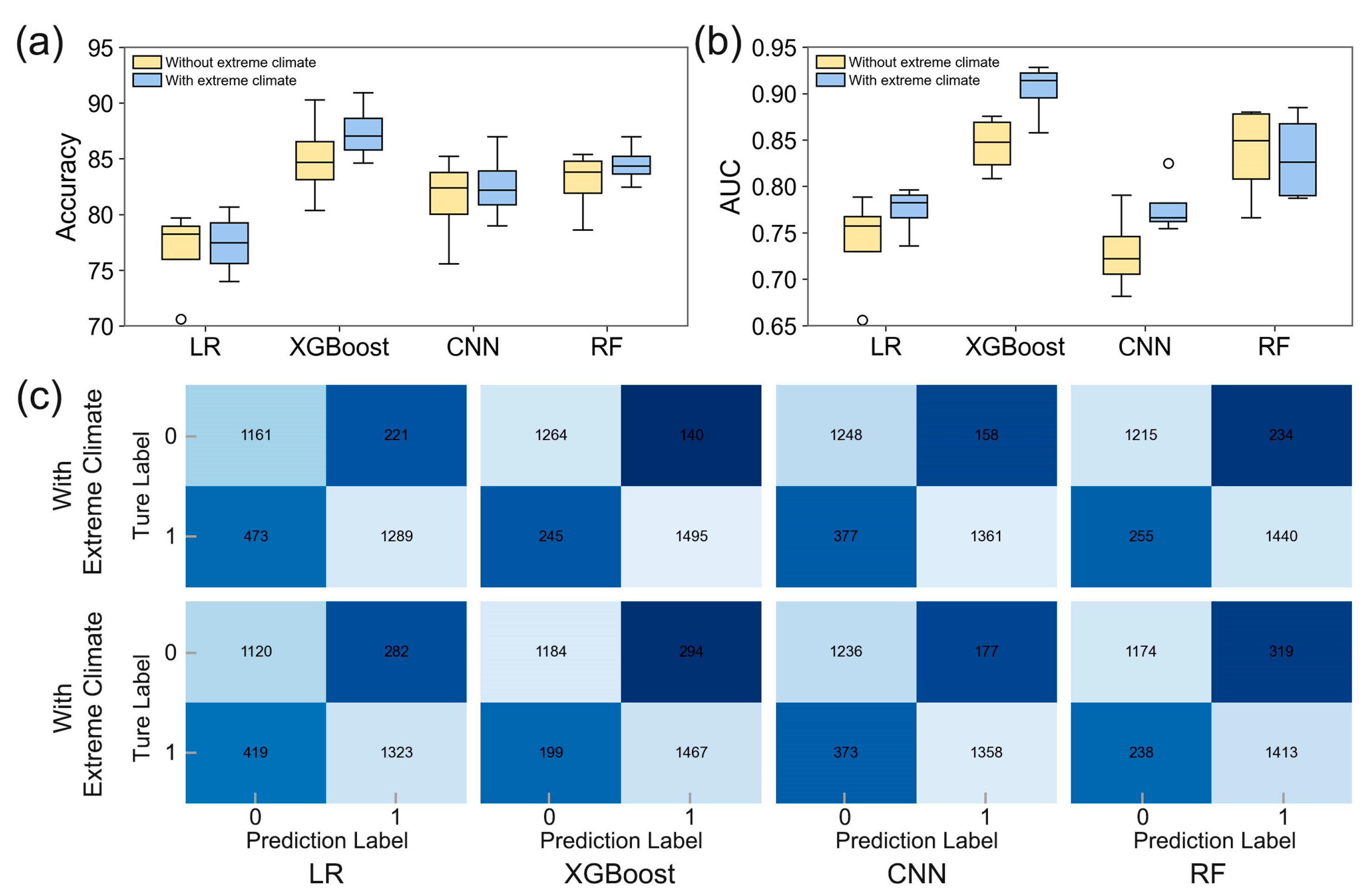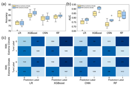 Comparison of model performance. Boxplots of models with and without extreme climate factors ((a): accuracy; (b): AUC) and confusion matrices (c).