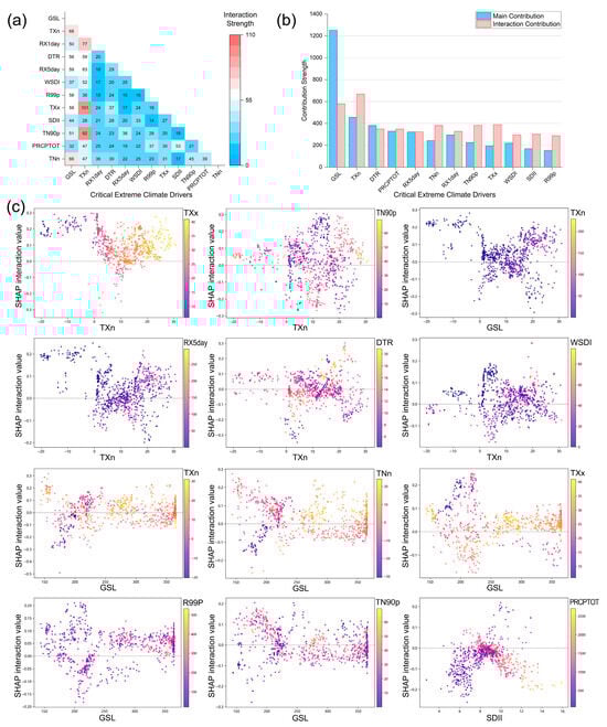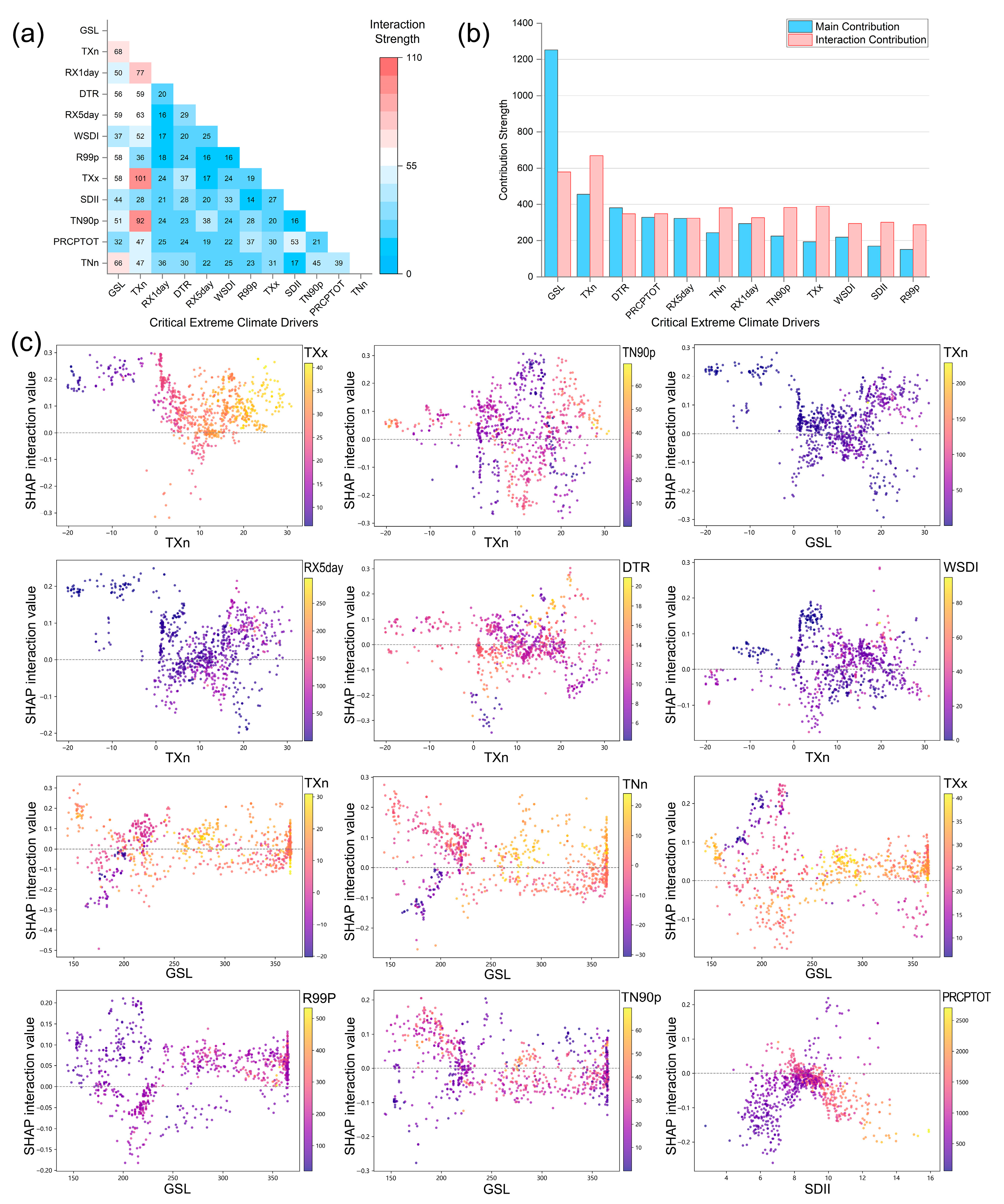 Interactions among key extreme climate factors: (a) interaction strength, (b) comparison of main and interaction contributions, (c) SHAP interaction dependence plots.