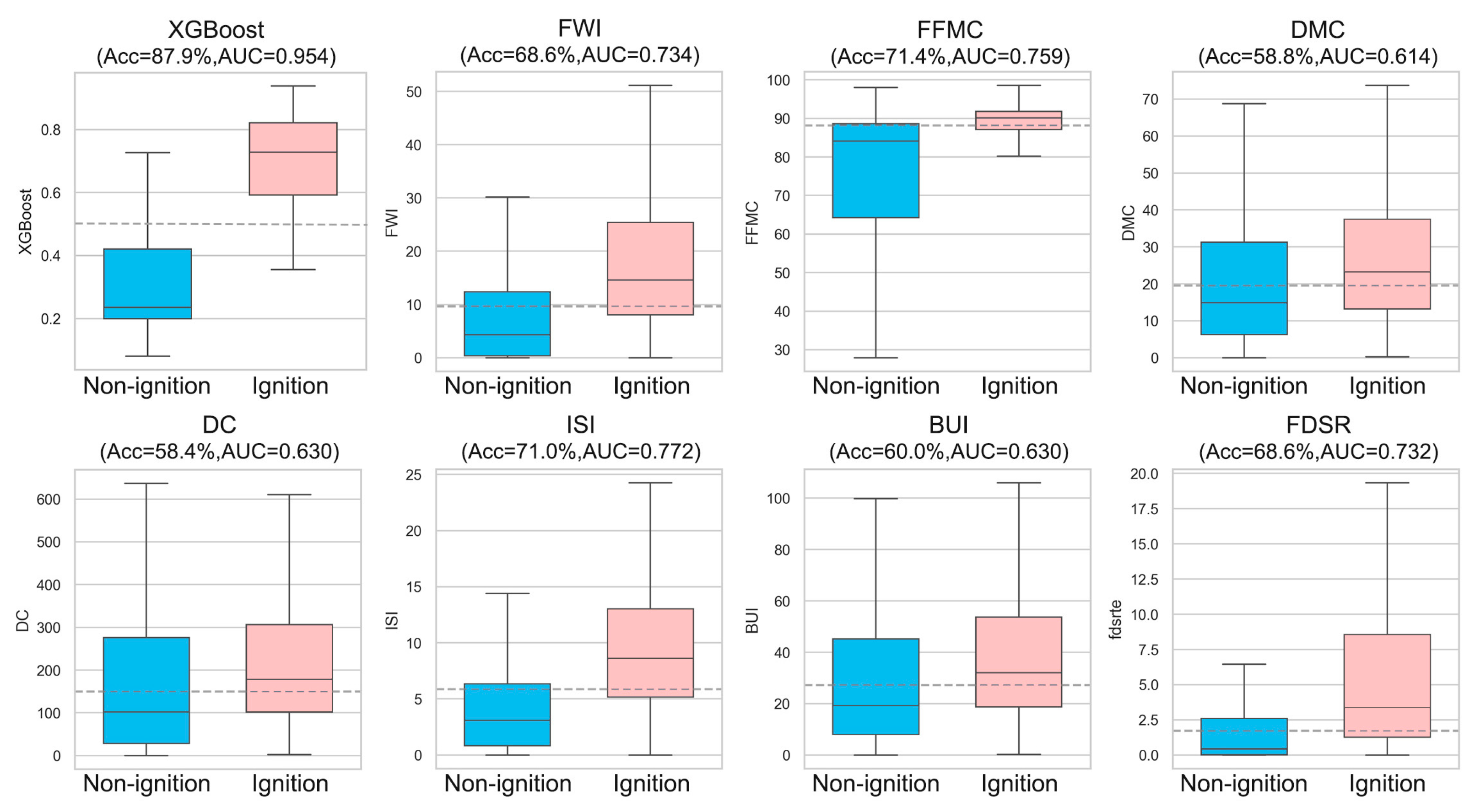 To provide a baseline comparison, we evaluated the classification accuracy of XGBoost against seven commonly used fire weather indices (Figure 3). Using the median of each index as the threshold, the accuracy of the fire weather indices ranged from 60% to 71.4%, whereas XGBoost achieved 87.9%. It is important to emphasize that the fire weather index system was developed for overall fire danger rating rather than for predicting lightning ignition probability. Therefore, its lower accuracy in our study mainly reflects differences in application context rather than a limitation of the indices themselves. In contrast, XGBoost integrates multisource environmental variables and extreme climate indices, allowing it to capture the nonlinear mechanisms related to lightning ignition more effectively. As a result, it shows a higher discriminative ability for this specific prediction task.