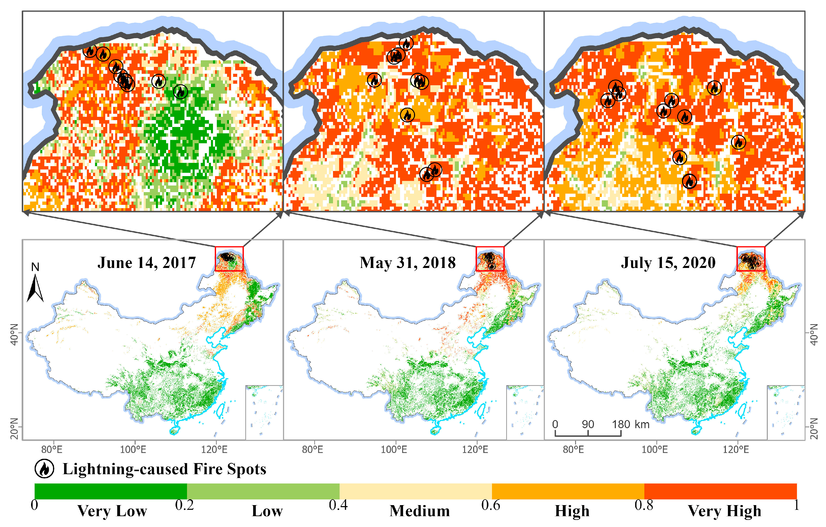 The top three dates with the highest number of lightning-ignited fires were selected to generate spatial risk maps (Figure 4). Among the 29 lightning-ignited fires recorded on these three days, 26 occurred in very high risk grids, one in a high risk grid, one in a medium risk grid, and only one in a low risk grid. This indicates that the constructed model effectively identifies high risk areas for lightning-ignited fires, with predictions highly consistent with observations. The peak months for lightning-ignited fire occurrence were mainly from May to July, and spatially concentrated in northeastern China, particularly the Daxing’an Mountains. This region, located at high latitudes with frequent thunderstorms, is dominated by coniferous forests with abundant and continuous fuel, providing typical conditions for lightning-ignited fires.
