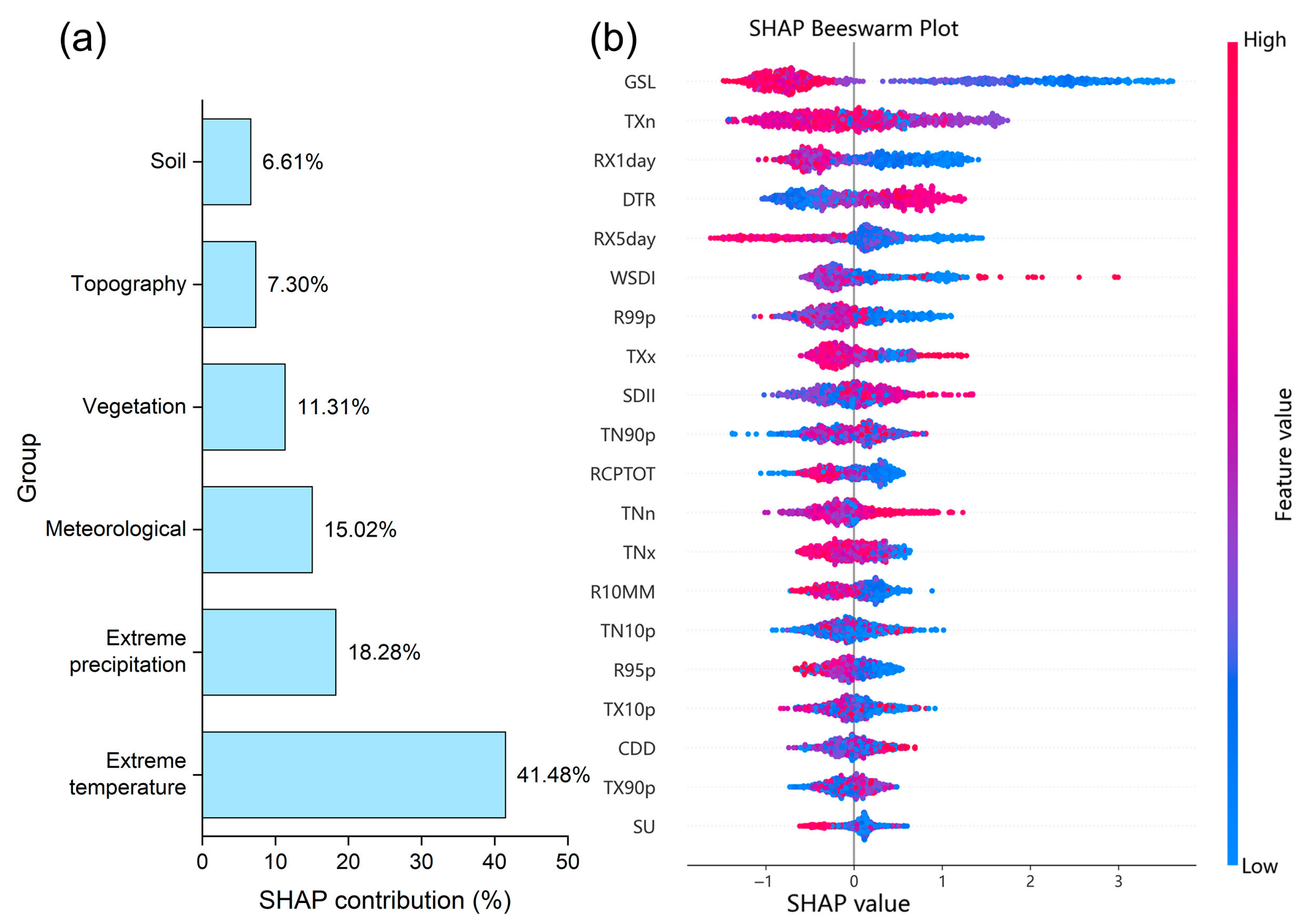 SHAP contribution ranking for lightning-ignited fires: (a) grouped contributions of all factors, (b) top 20 extreme climate factors.