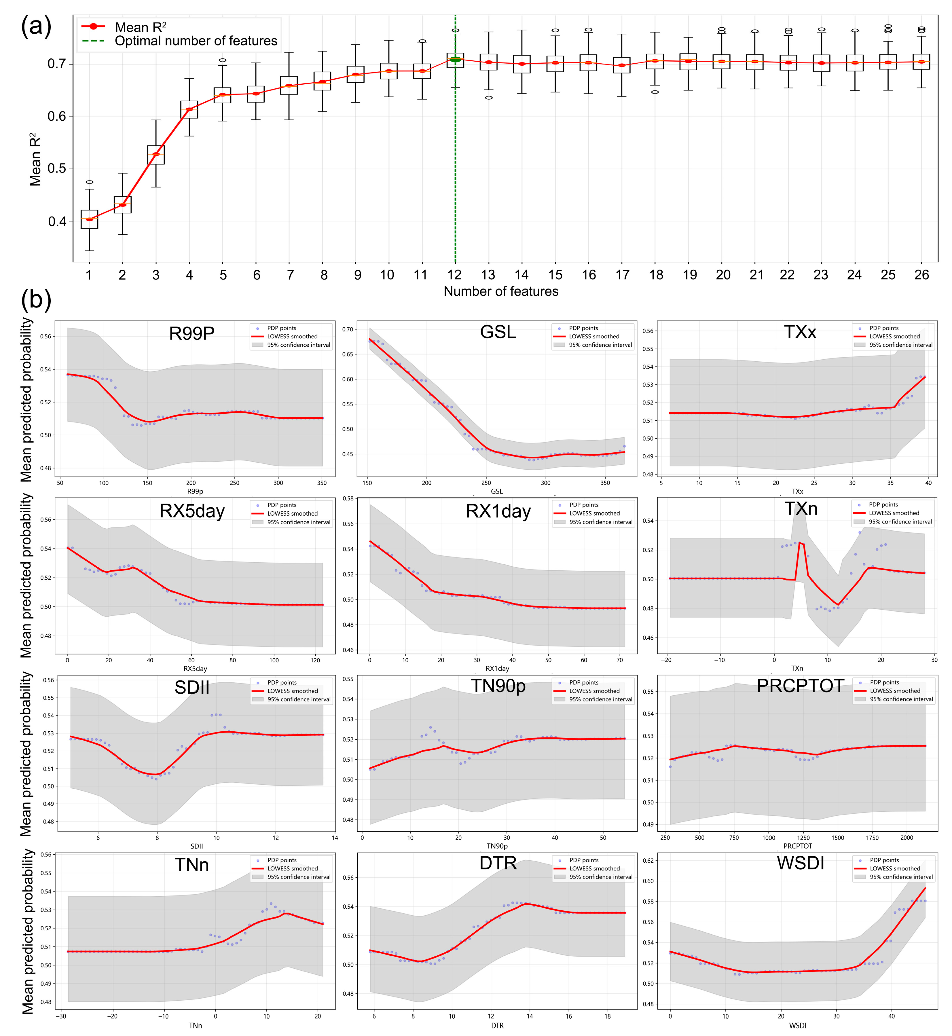 Key extreme climate factors: (a) feature selection results, (b) partial dependence plots.