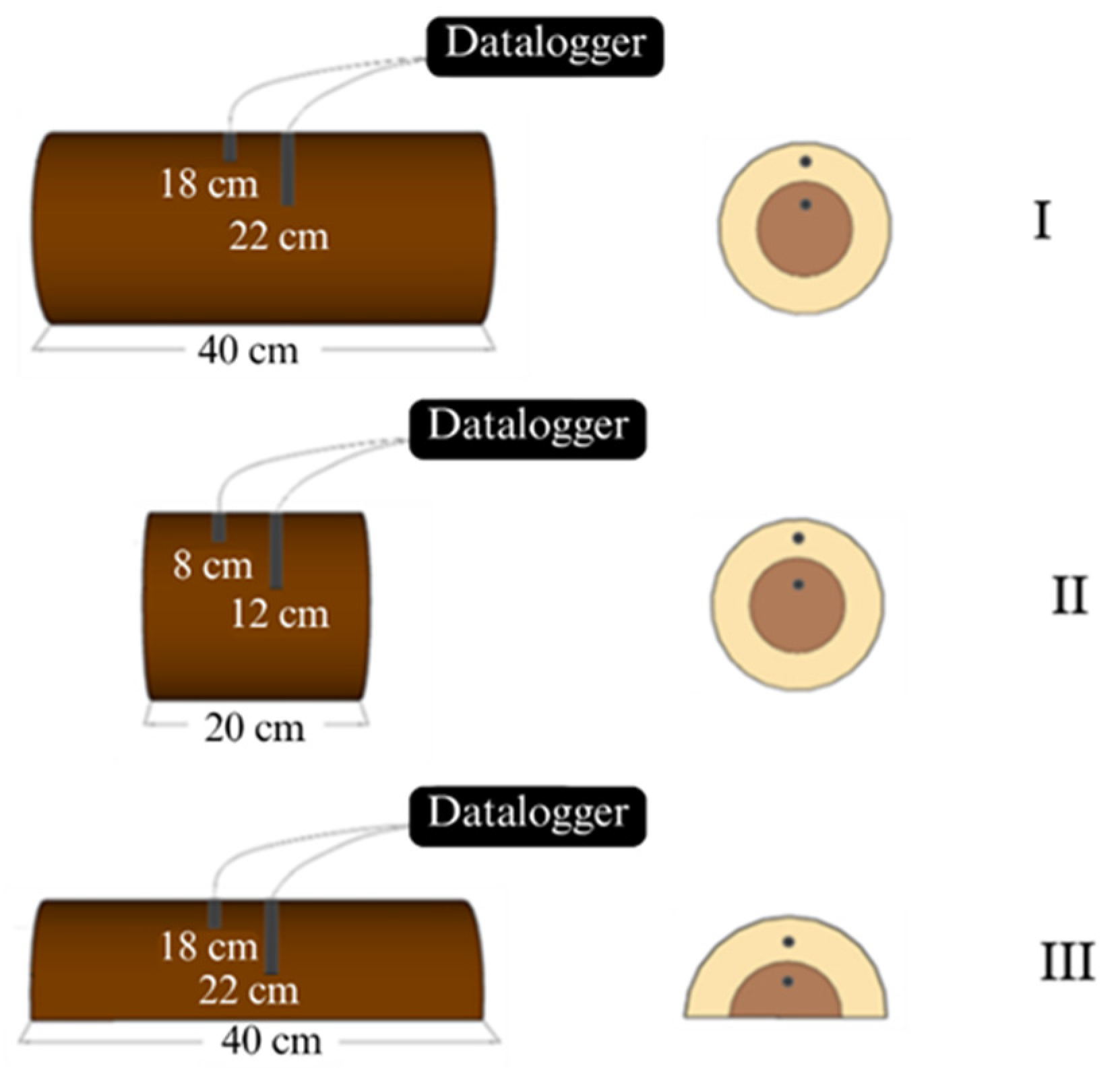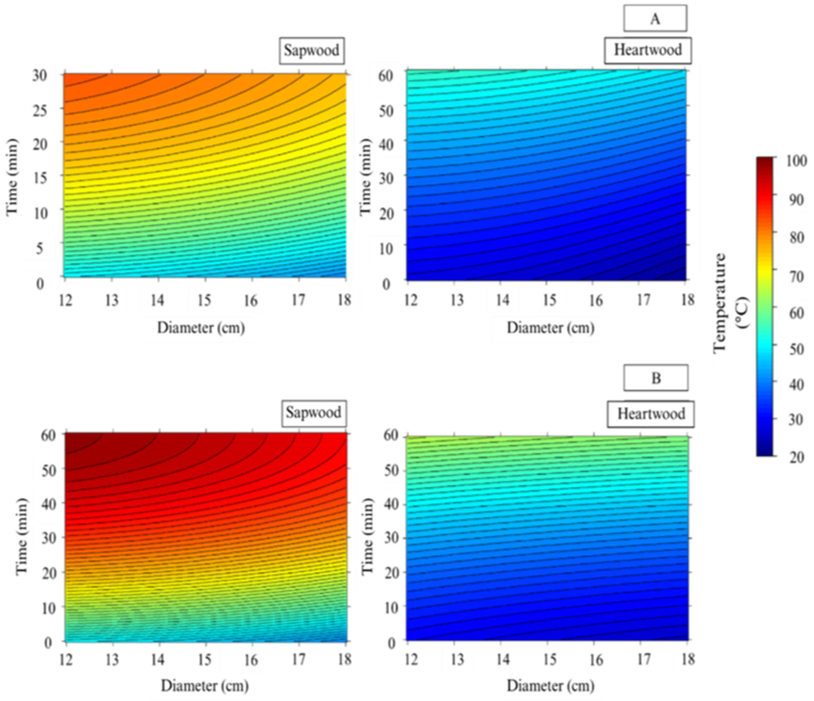 24]. In split logs, part of the heartwood was exposed to the external surface, allowing direct contact with the heat source and a greater temperature increase, although still not reaching the levels observed in sapwood within the same time interval.