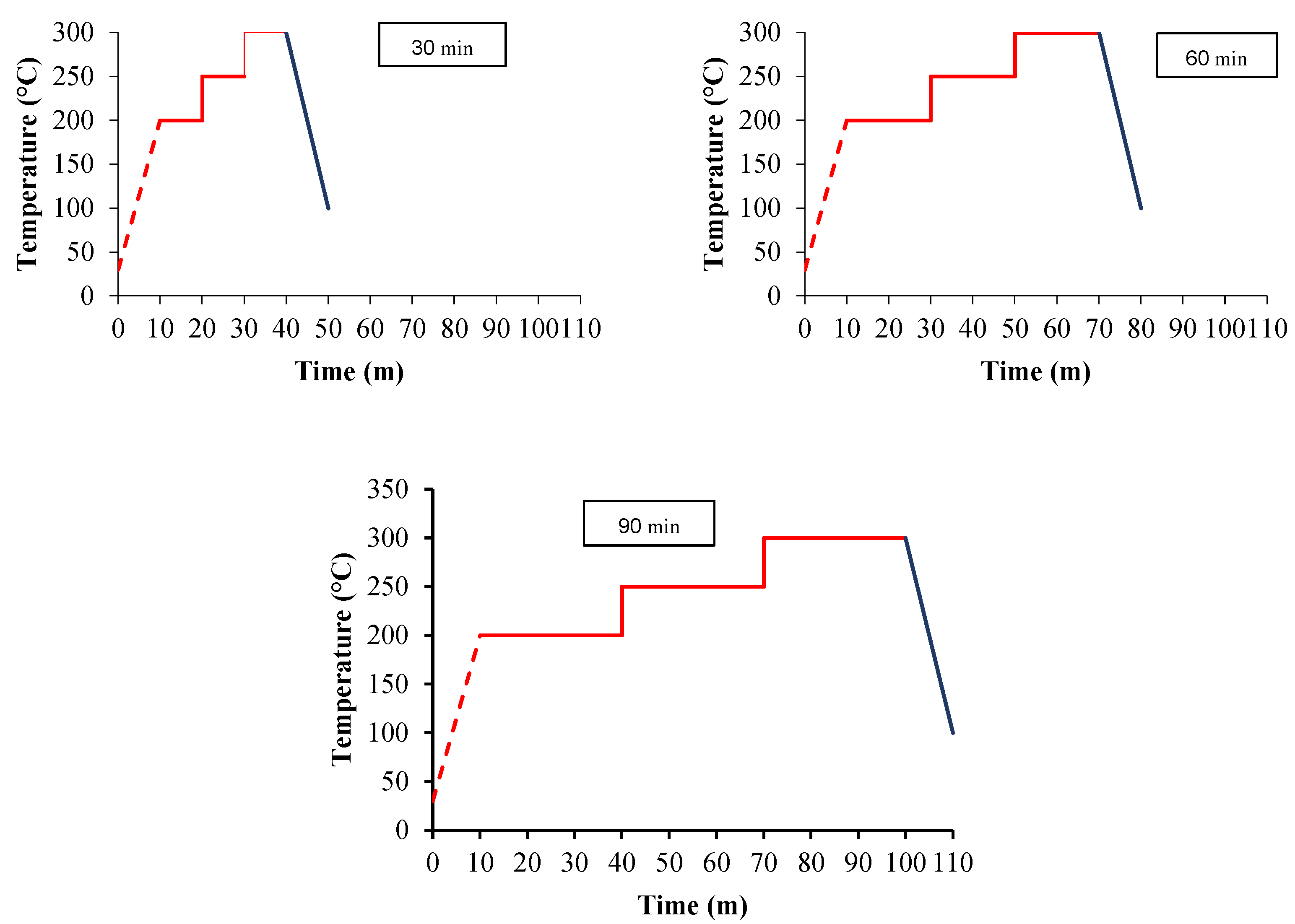 Second stage: Temperature increase up to 300 °C, with variation in the drying rate depending on the residence time. For durations of 30 and 60 min, the temperature was increased by 50 °C every 20 min. For 90 min, the increase was 50 °C every 30 min. This gradual increment was necessary to maintain a constant drying rate.