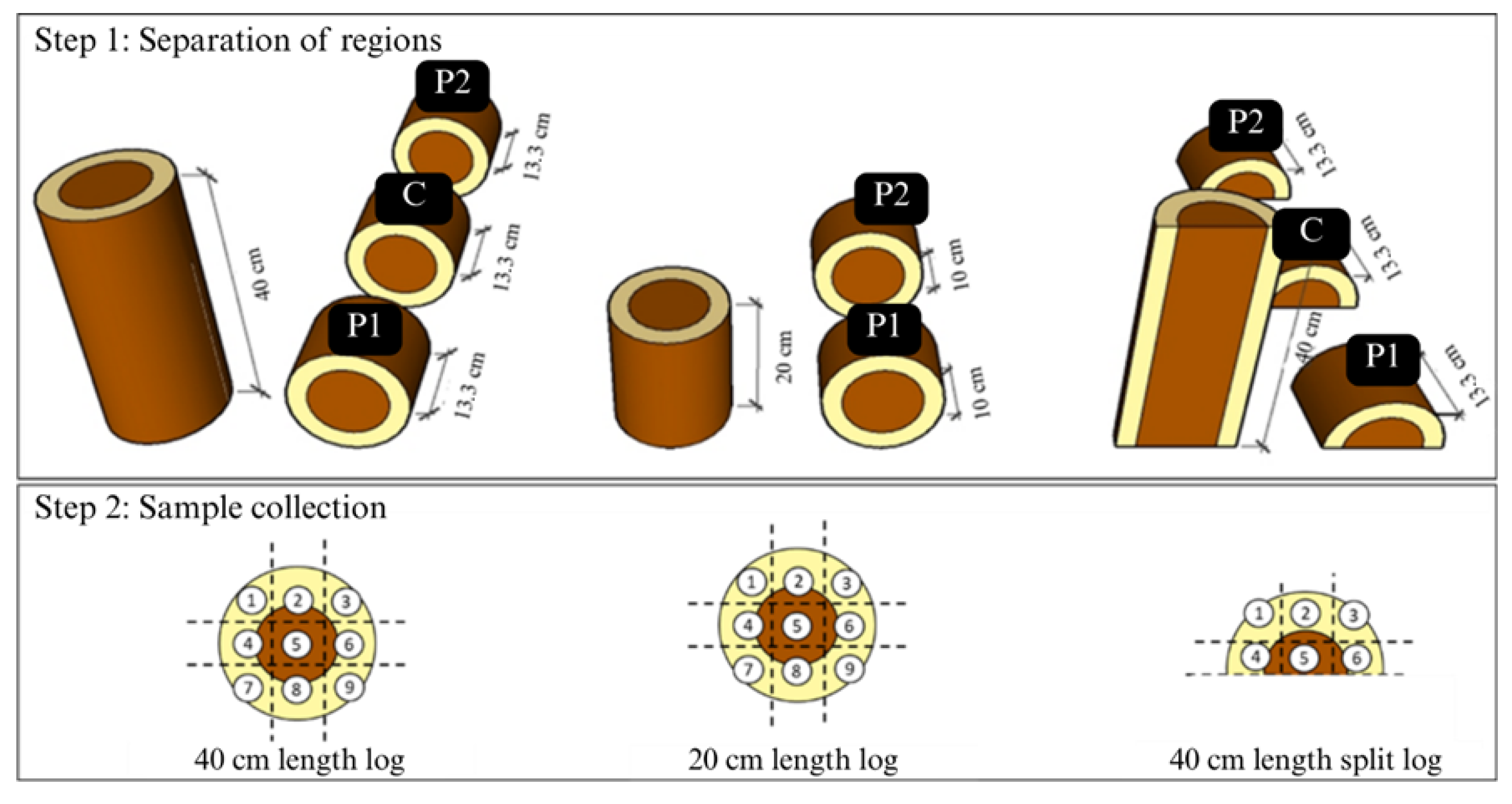 Two types of sectioning were performed on the collected wood samples to create the moisture profile of the logs after drying, varying according to the cutting layout and the length of the logs:
