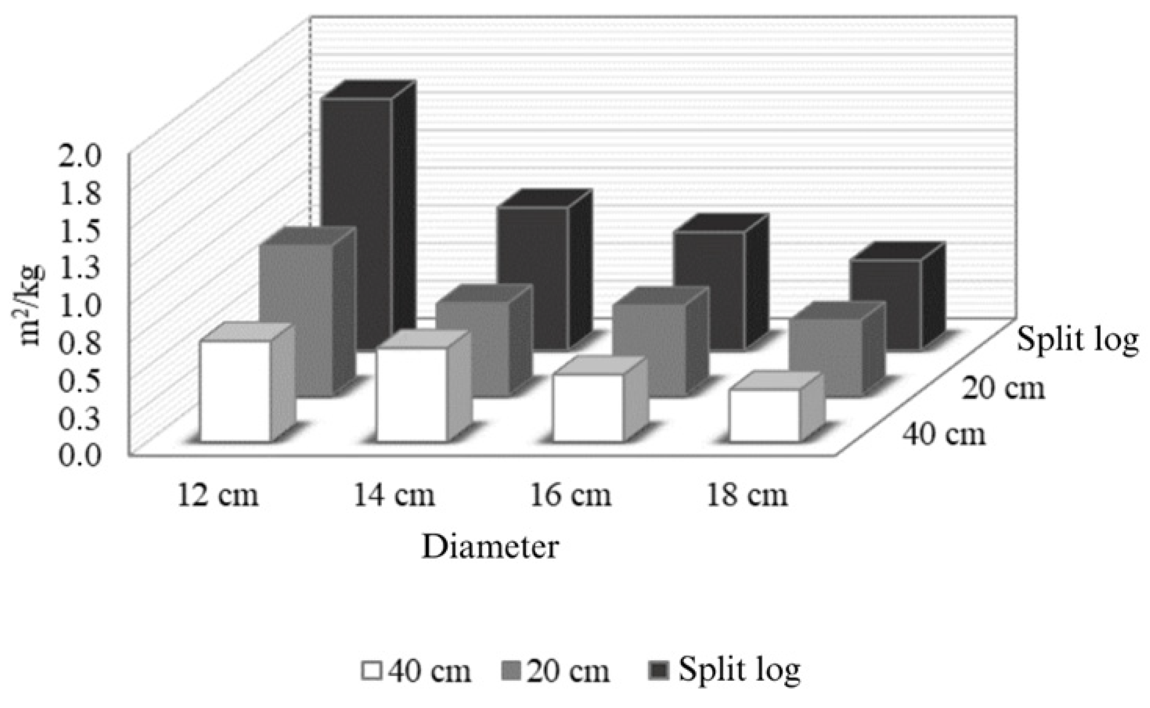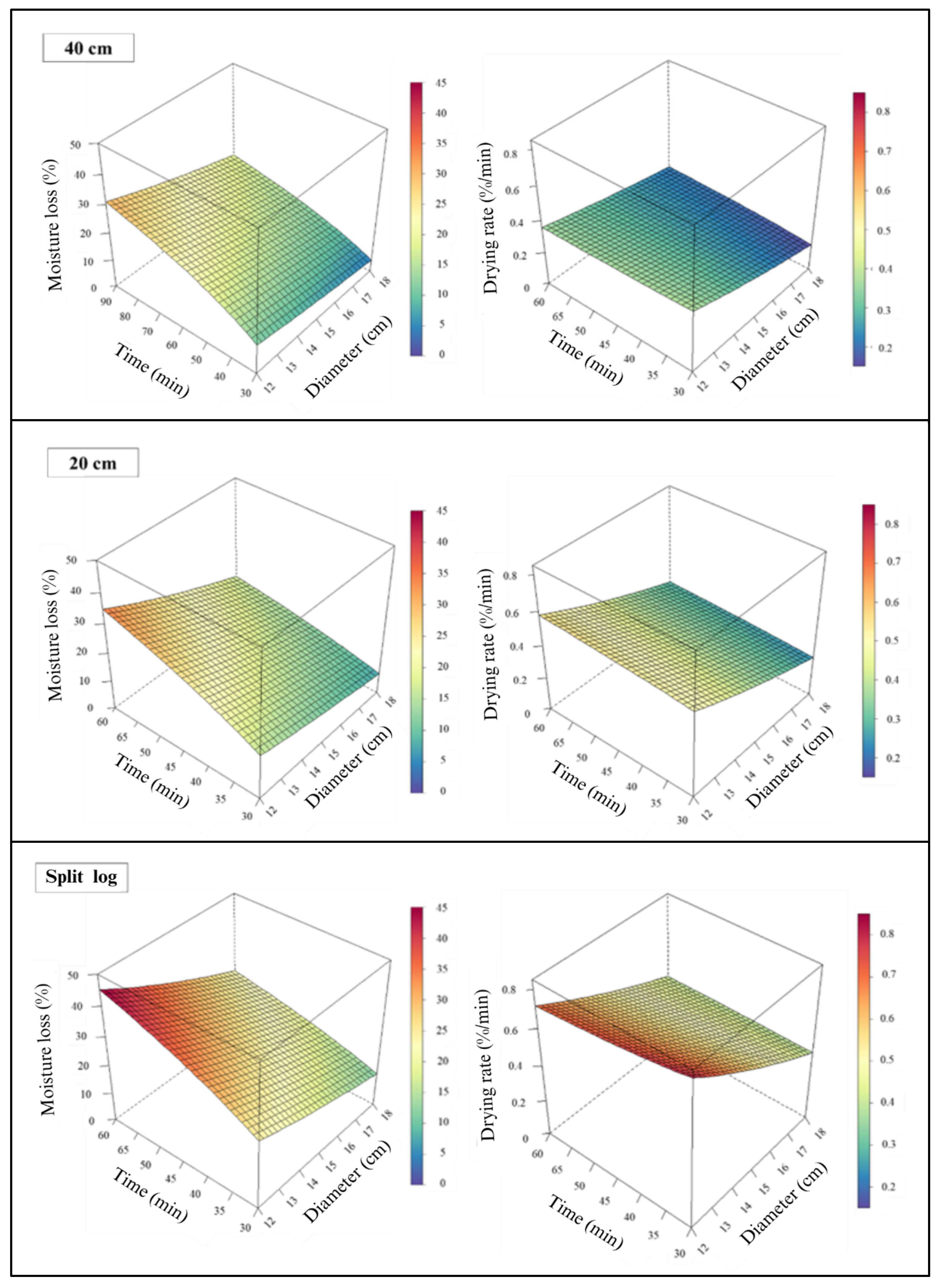 24], confirmed that log diameter and, consequently, geometry and the surface-to-volume ratio significantly affect drying efficiency when studying different diameters of