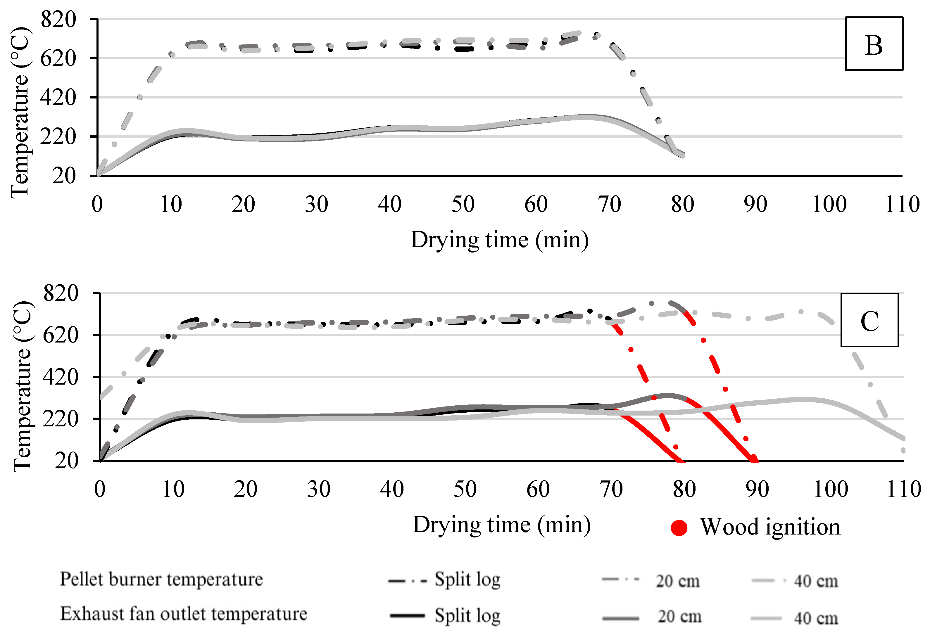23]. Efficiency is also affected by the heat source and its application method. Integrating heat from carbonization gases into the drying process can reduce reliance on external fuels, provided the thermal supply remains stable. Overall, log geometry and the effective use of available heat are key factors for optimizing artificial drying [