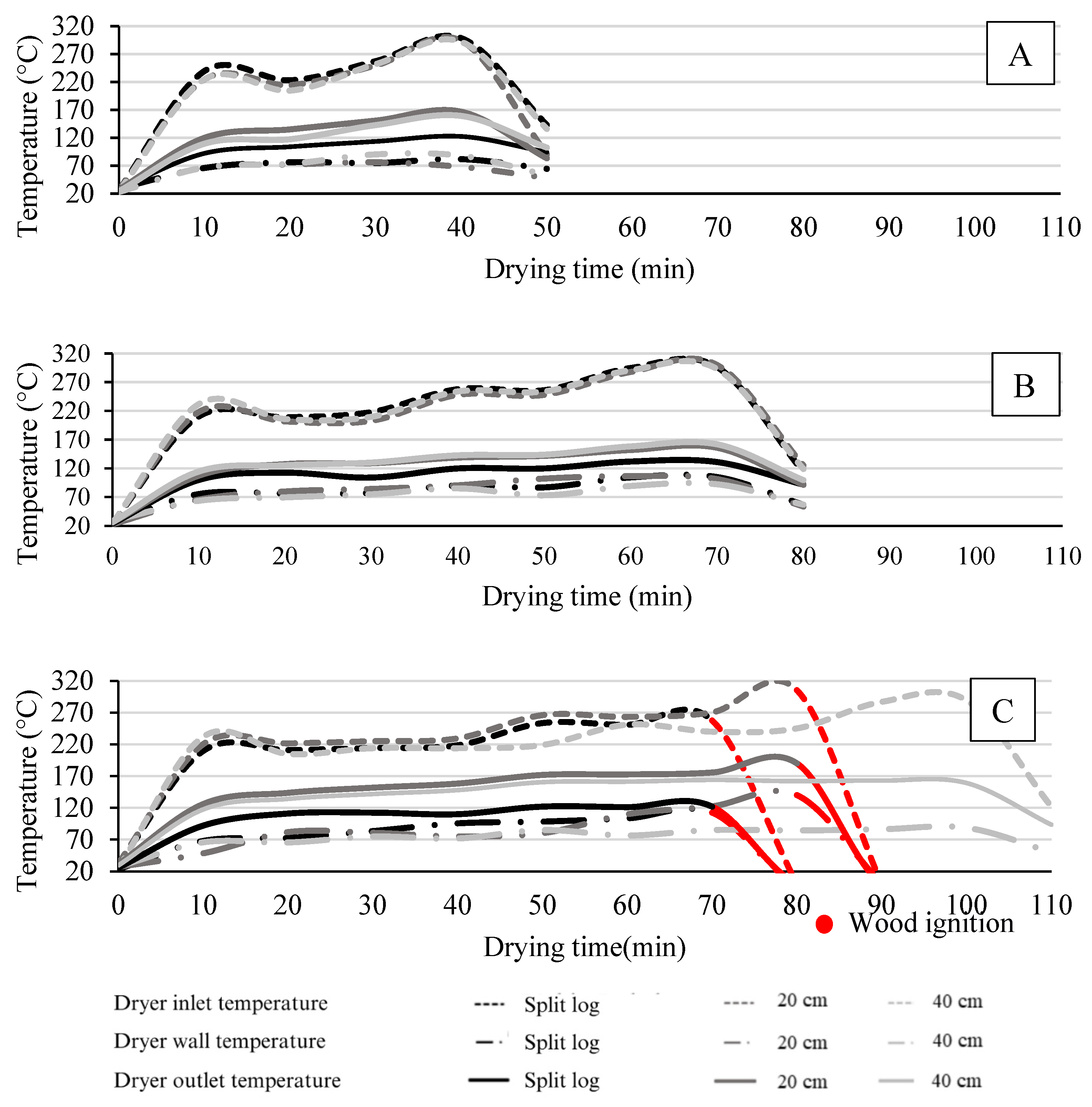 In summary, the observed thermal profiles reinforce the need for customized drying protocols based on wood quality and processing layout. Optimizing these parameters can significantly improve energy efficiency and product quality in continuous carbonization systems.