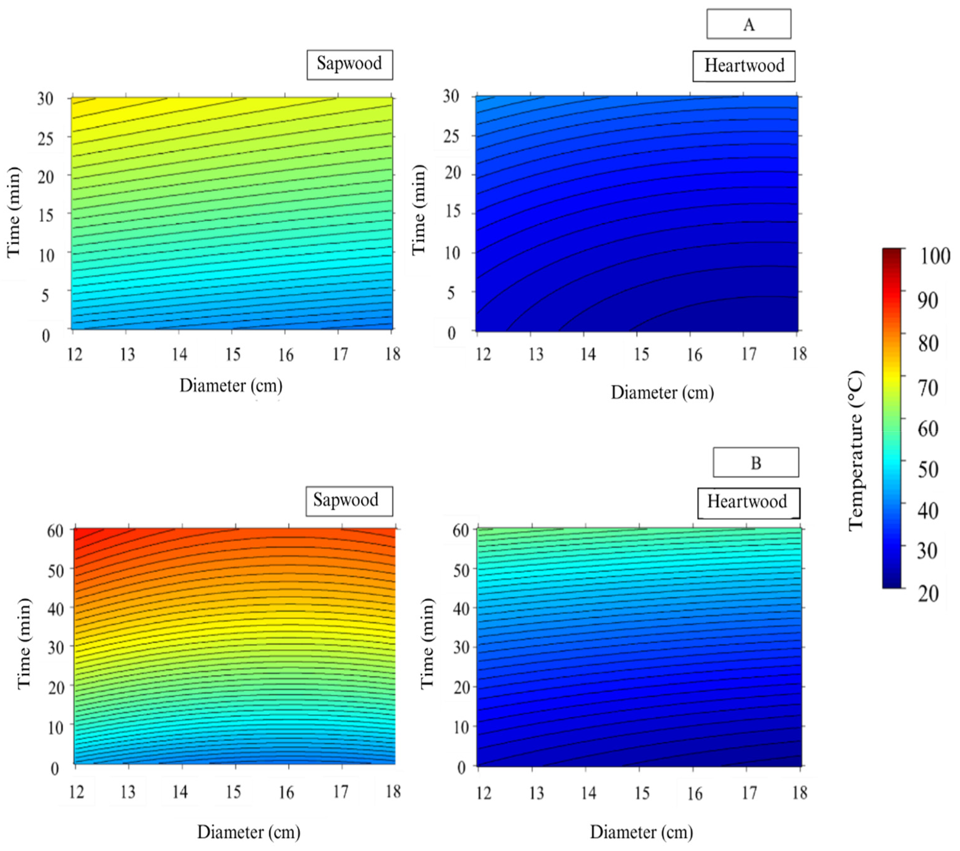 Logs with larger diameters exhibited lower heating in both sapwood and heartwood, showing greater resistance to convective heat transfer. The increase in wood temperature with longer residence time is attributed to prolonged exposure to the heat source, enhancing heat transfer.