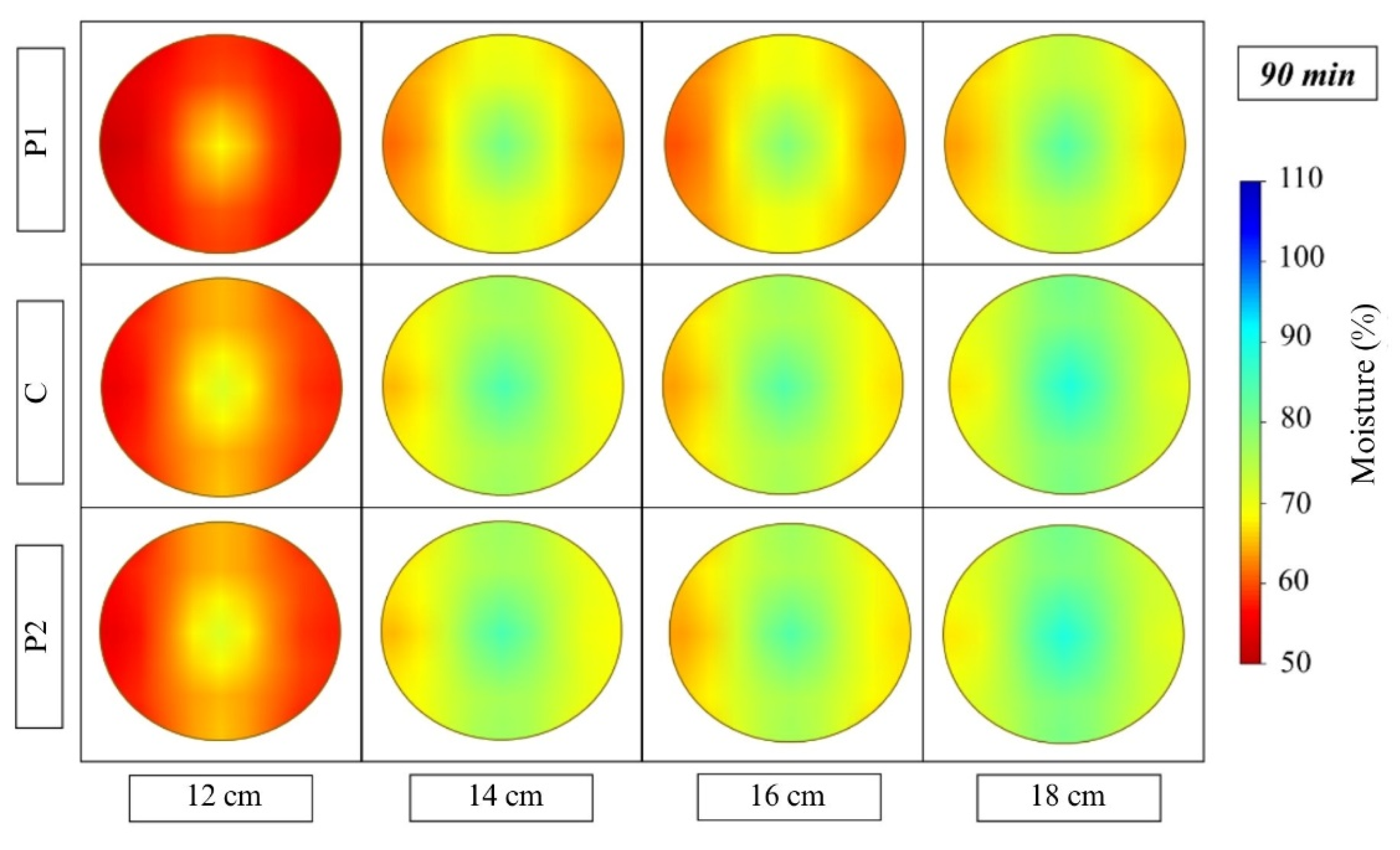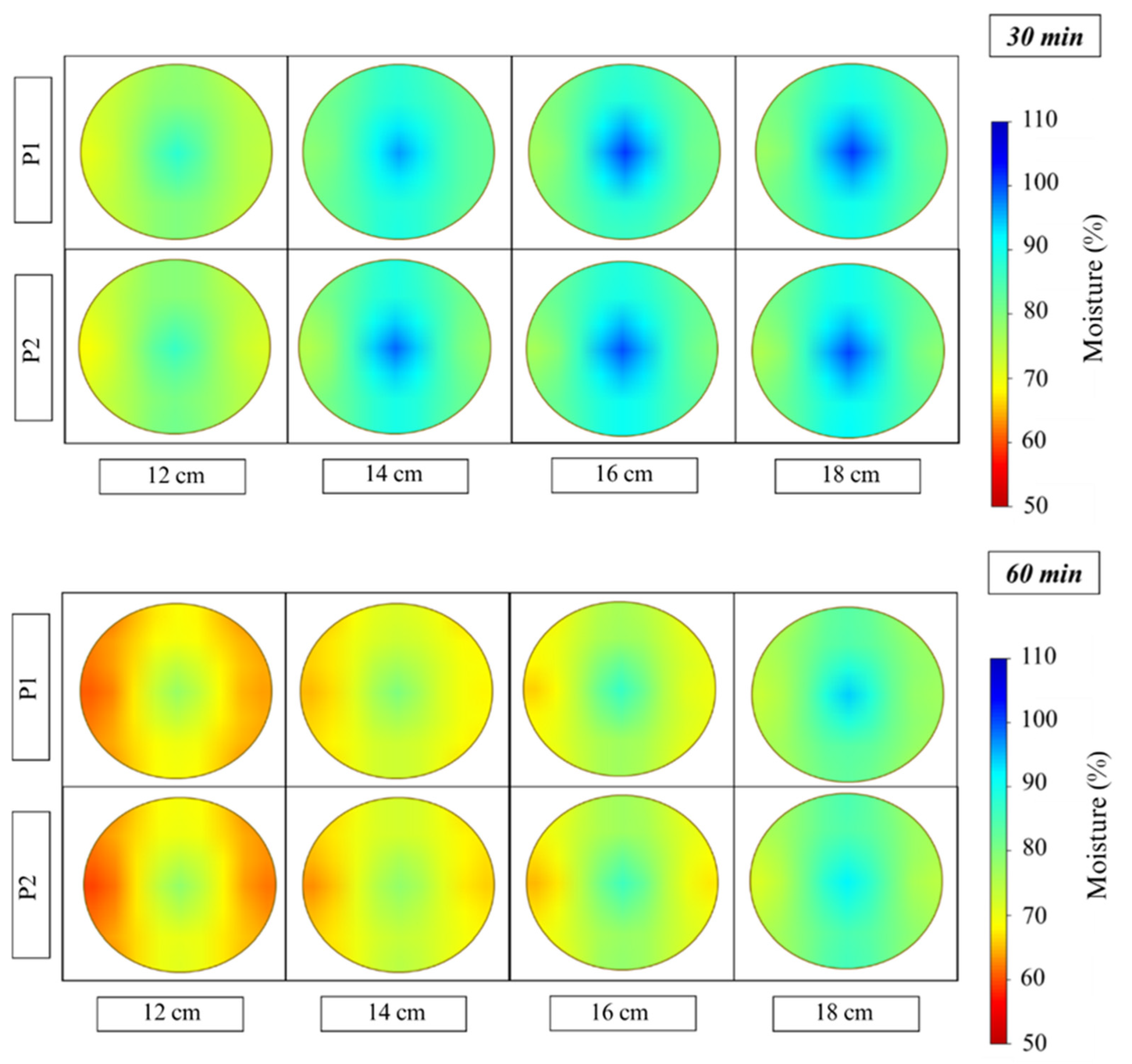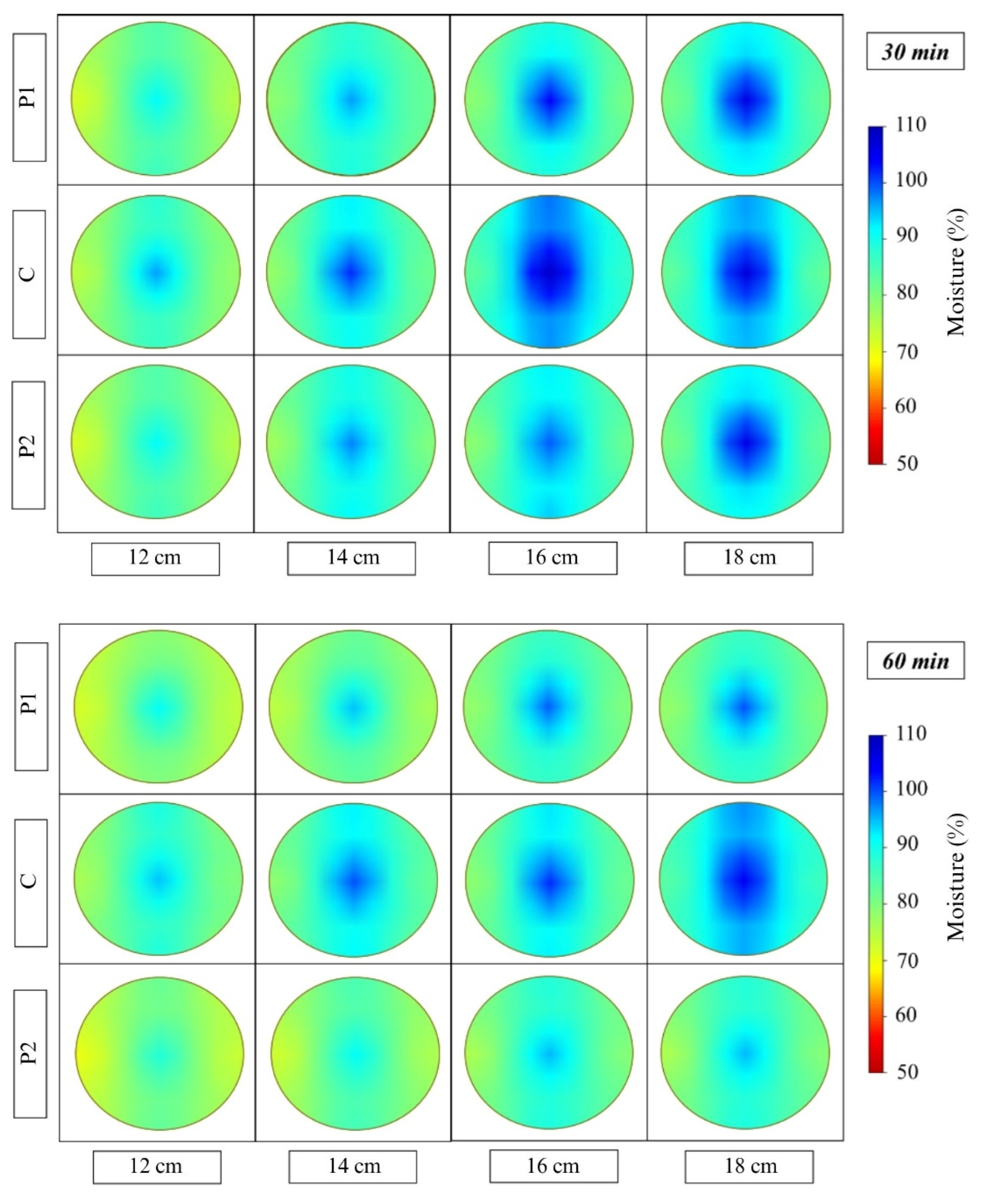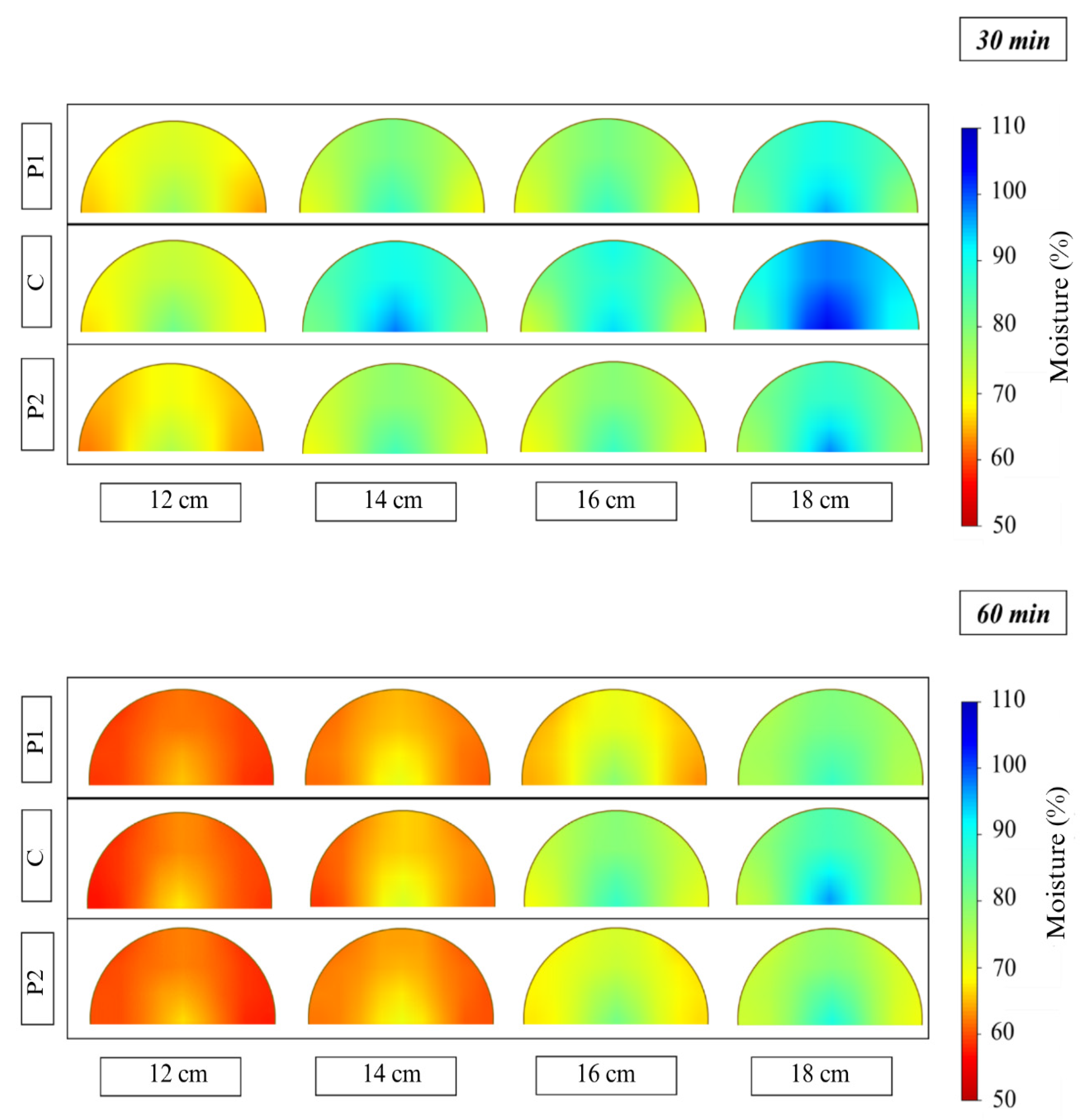 Figure 14) provide a detailed visualization of moisture distribution as a function of diameter, log region, and drying residence time, for different cutting patterns. These spatial analyses of moisture are crucial for understanding the dynamics of drying and identifying the most critical areas for water removal within the wood matrix.