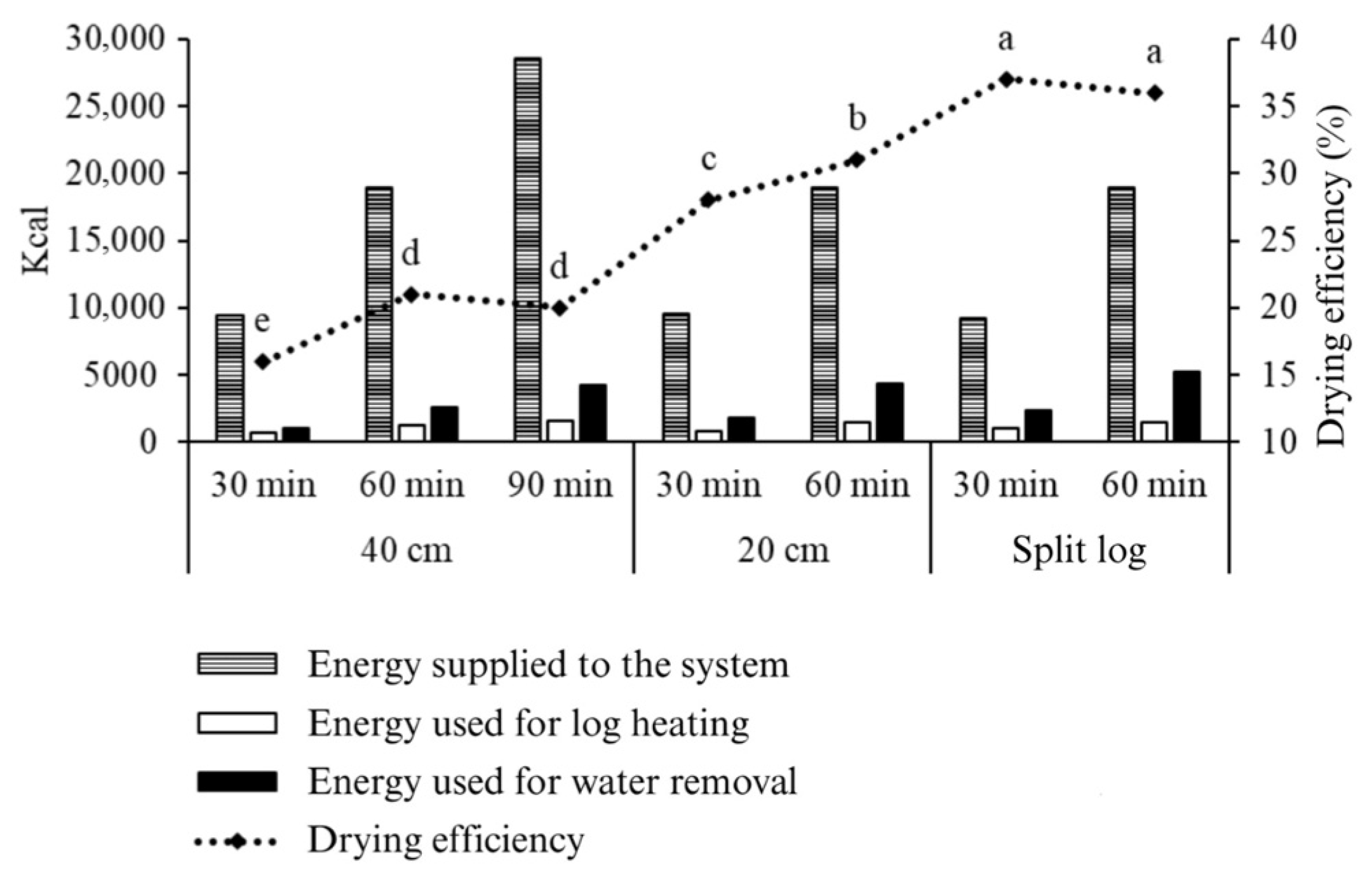 The energy efficiency of drying indicates how effectively wood logs utilized the available energy in the dryer for heating and moisture loss. For 40 cm logs, the energy supplied ranged from approximately 9000 kcal for 30 min, to around 19,000 kcal at 60 min, and reached nearly 29,000 kcal at 90 min. However, this increase in supplied energy did not translate linearly into higher efficiency, especially for longer drying times. Split logs exhibited the best energy efficiency due to their larger contact area with the heat source, resulting in higher drying rates and greater moisture loss. Nevertheless, combustion observed in split logs and 20 cm logs after 90 min of drying limited the operational feasibility of these treatments under these conditions. These results are consistent with those reported by Oliveira et al. [