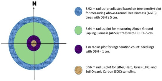Using a stratified random sampling approach, six circular plots of 250 m2 (0.025 ha each) were established with a sampling intensity of 0.05%. Each plot was designed with concentric subplots: