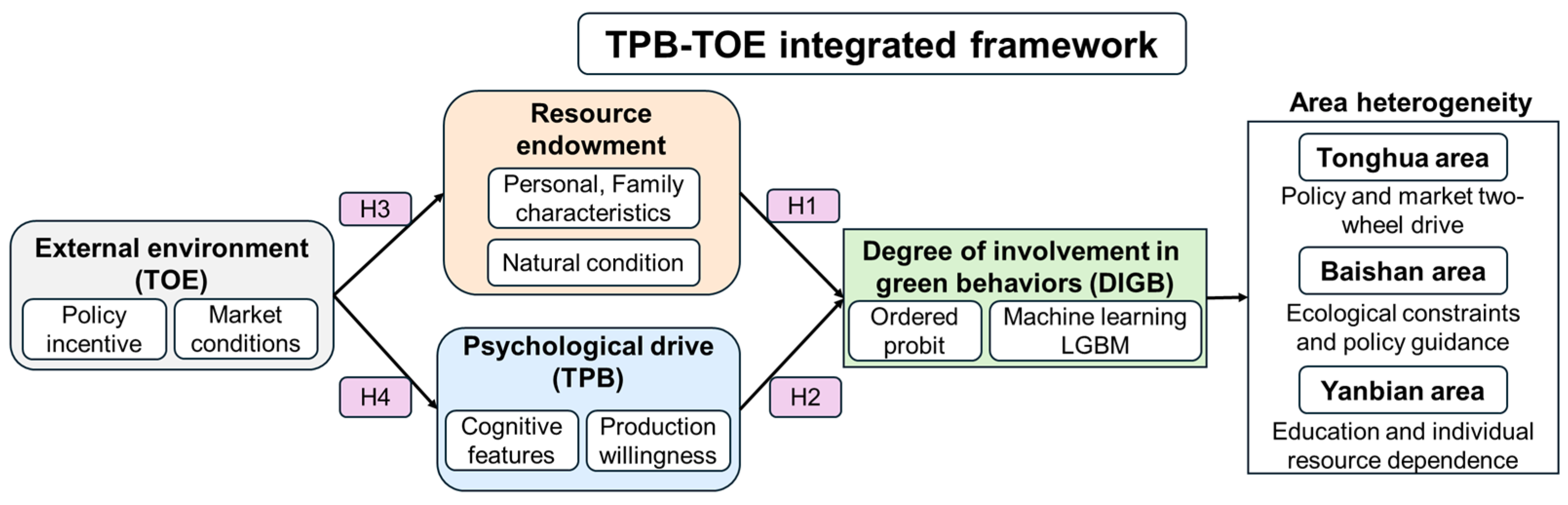 - Xu, Z.; Meng, W.; Li, S.; Chen, J.; Wang, C. Driving factors of farmers’ green agricultural production behaviors in the multi-ethnic region in China based on NAM-TPB models. Glob. Ecol. Conserv. 2024, 50, e02812. [Google Scholar] [CrossRef]