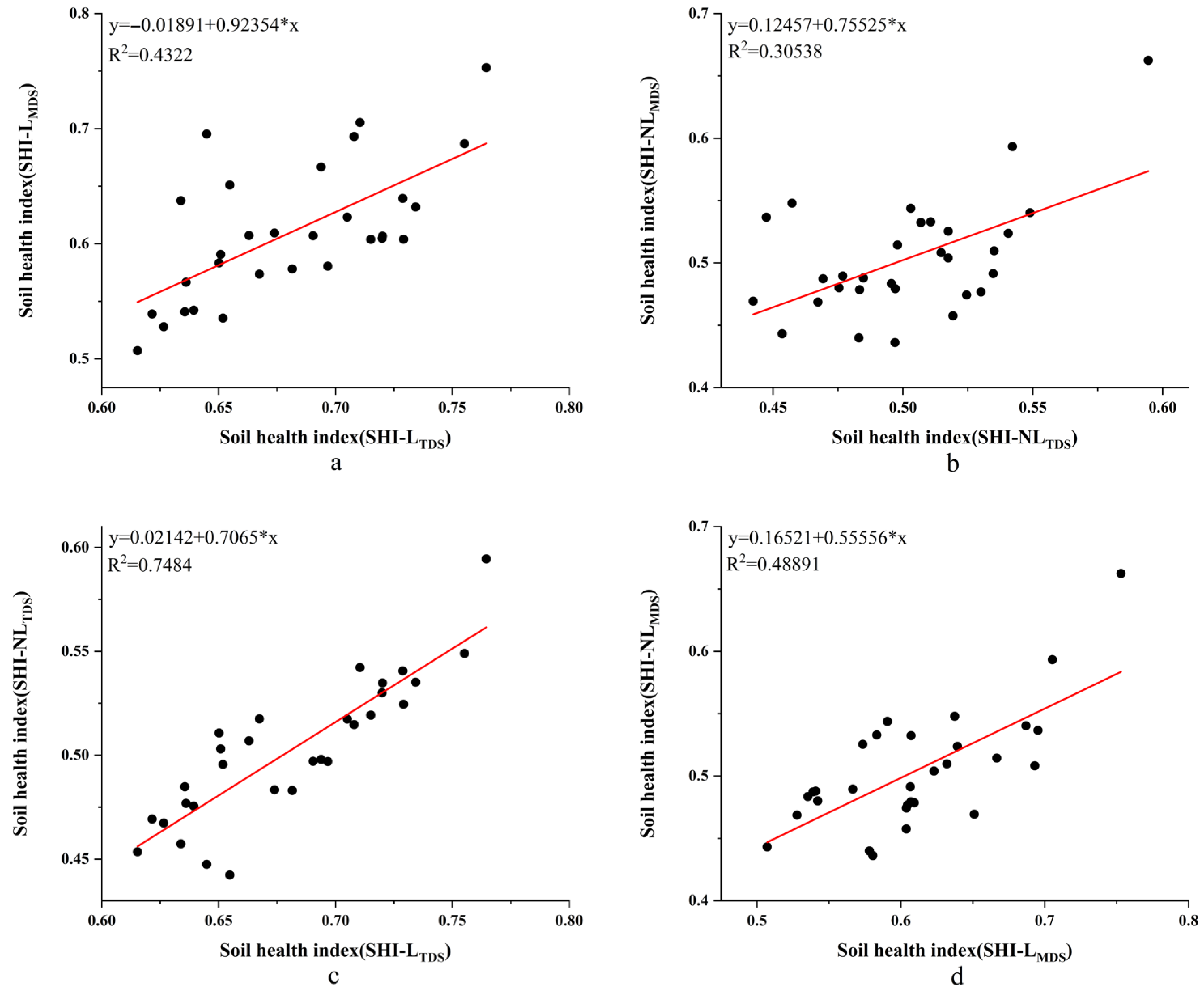 - Establishment of an SHI-based Early Warning and Intervention Mechanism: The SHI values obtained using linear and non-linear scoring functions ranged from 0.53 to 0.72 (mean 0.62) and 0.48–0.59 (mean 0.51), respectively, establishing the baseline soil health status for the region. Based on the more conservative non-linear scoring results, it is proposed to set an SHI value of 0.50 as the early warning threshold, triggering intensified monitoring and management optimization when values fall below this level. An SHI value of 0.48 should be established as the mandatory intervention threshold, necessitating practices such as crop rotation, fallowing, or comprehensive soil remediation when breached.