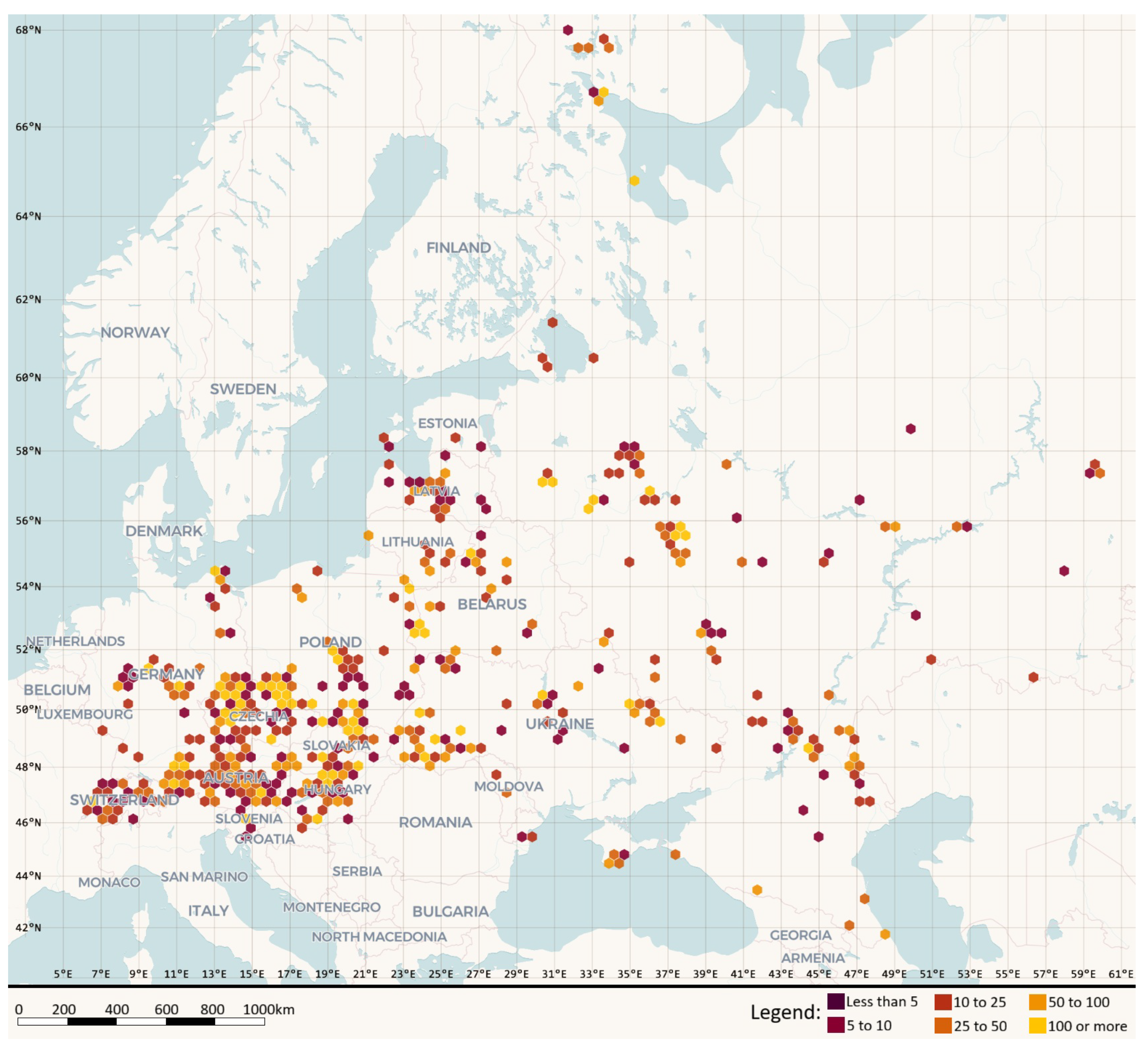 Figure 1, where records are aggregated to 20 km hexagons across Central and Eastern Europe.