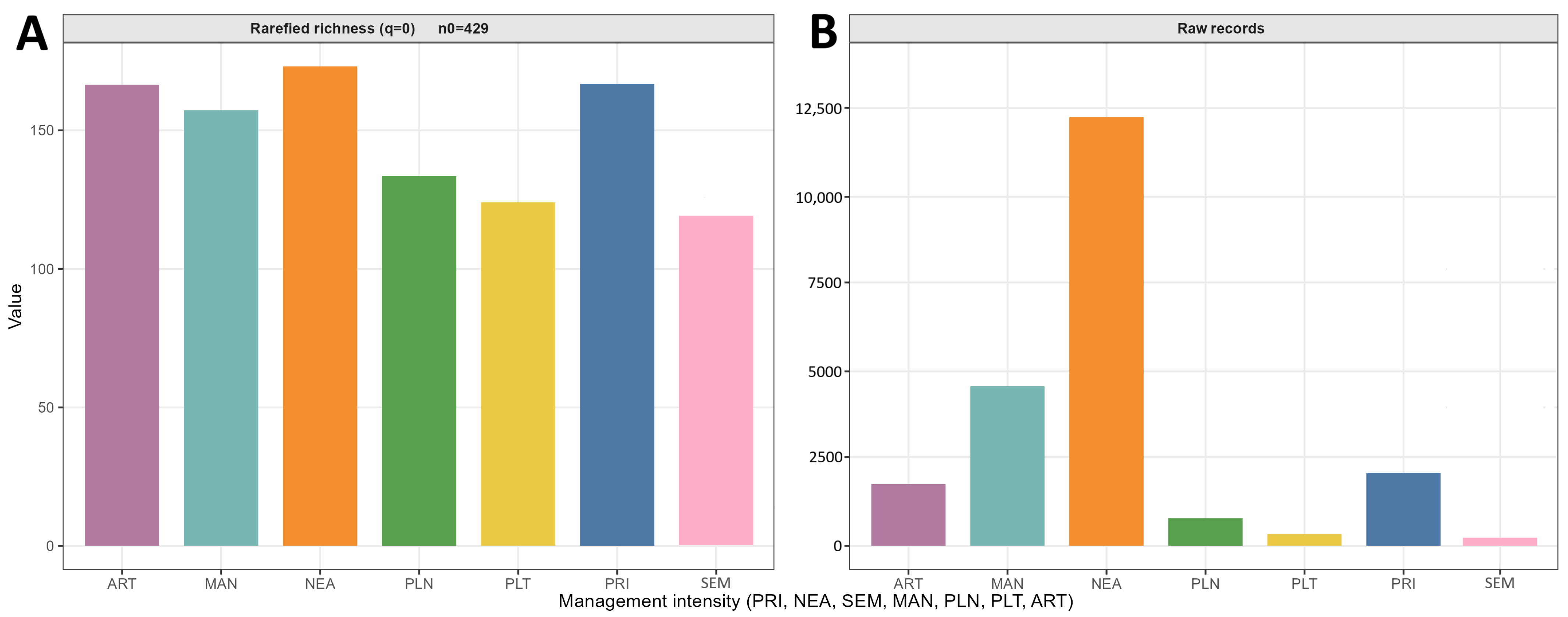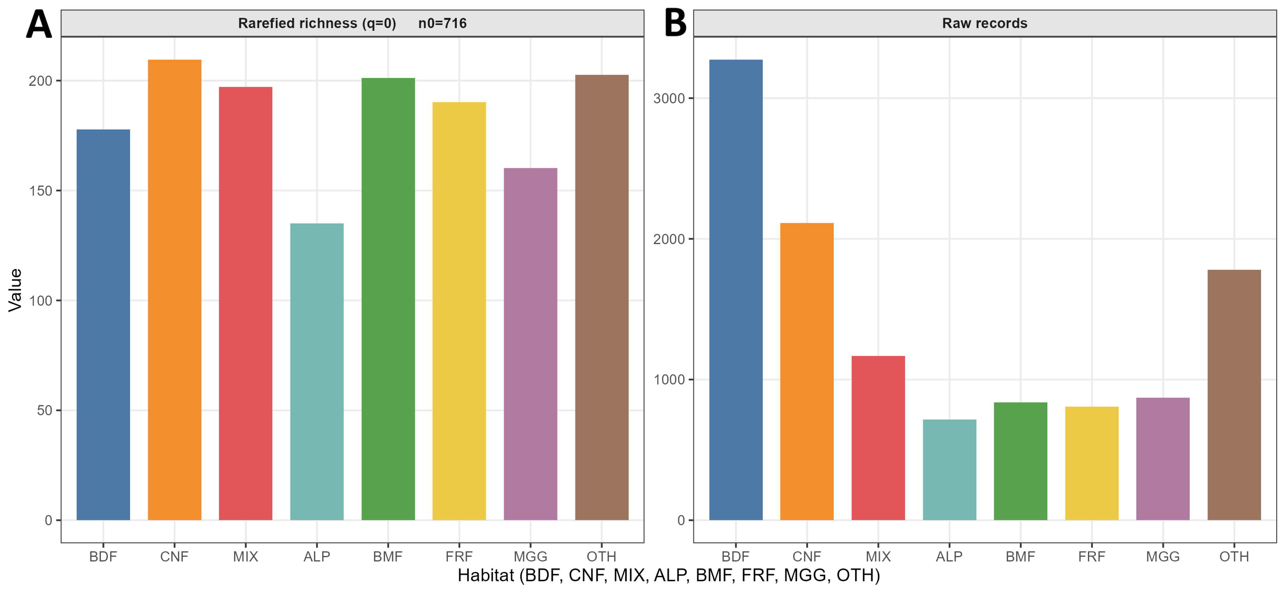 Coverage-standardised diversity patterns were congruent with the intensity contrasts. Coniferous habitats were richest across Hill orders; alpine or subalpine habitats were poorest; near-natural management exceeded planted systems; and richness peaked at mid elevations. In contrast, diversity weighted towards common species was greater at low elevations. Because elevation effects were habitat-specific, optima and tolerances differed among habitats and several responses approached gradient bounds, implying near-monotonic behaviour within the sampled ranges; elevation-aware interpretation was therefore essential.