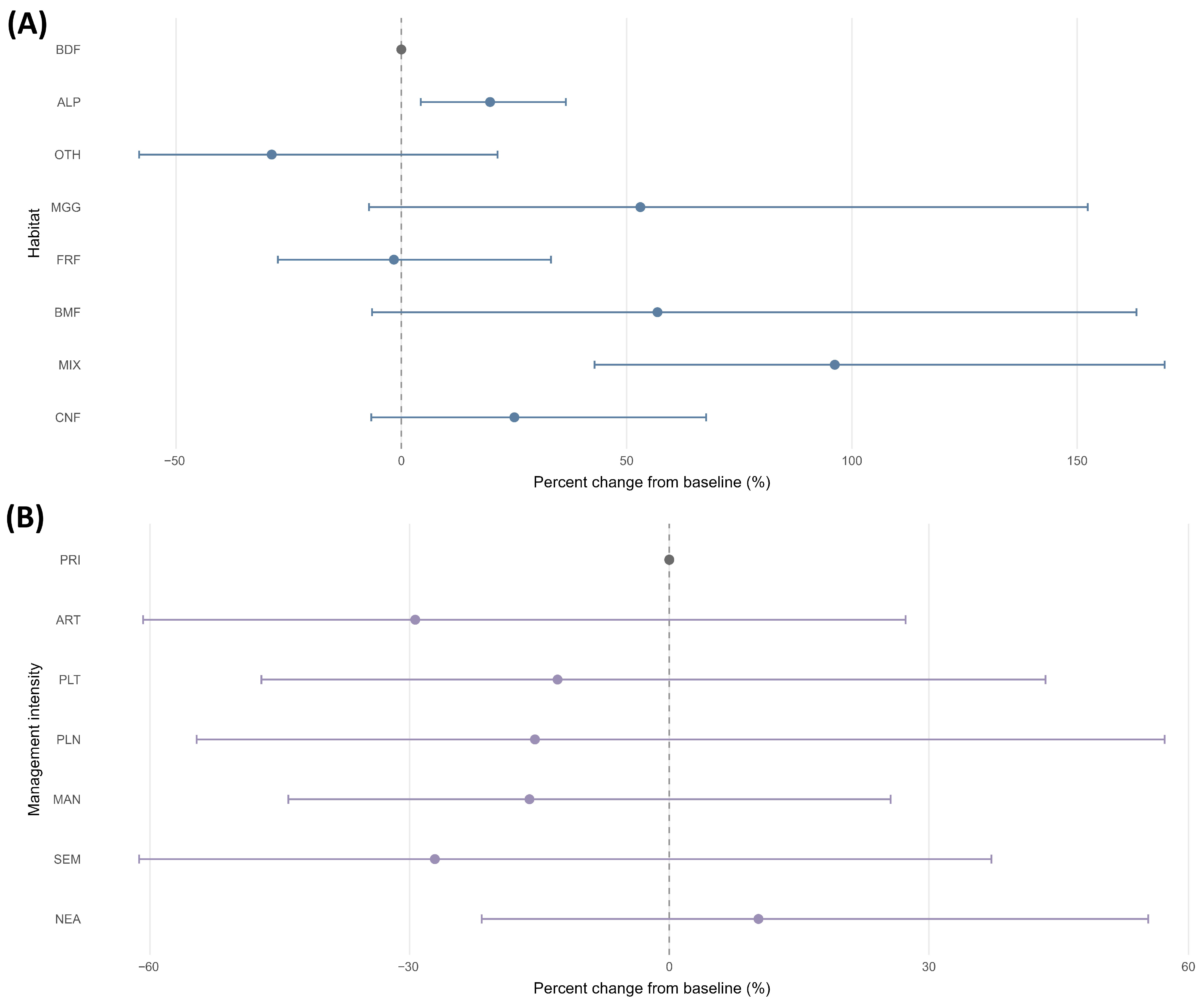 Assignments followed explicit decision rules recorded with the dataset. Original phytosociological or habitat terms were matched to the nearest overarching class using vegetation structure, tree dominance, hydrology, and elevational context; when provided, Natura 2000 codes guided the mapping. Where local labels mixed features of two classes, precedence was given to the dominant structural or hydrological signal (for example, bog woodland to BMF). Management intensity levels were assigned from source descriptions of logging history, planting, rotation structure, stand age distribution, dead wood volume, and hydrological alteration. These consolidations reduced category sparsity, enabled effort-controlled comparisons, and supported robust estimation and indicator testing while preserving traceability to verbatim labels.