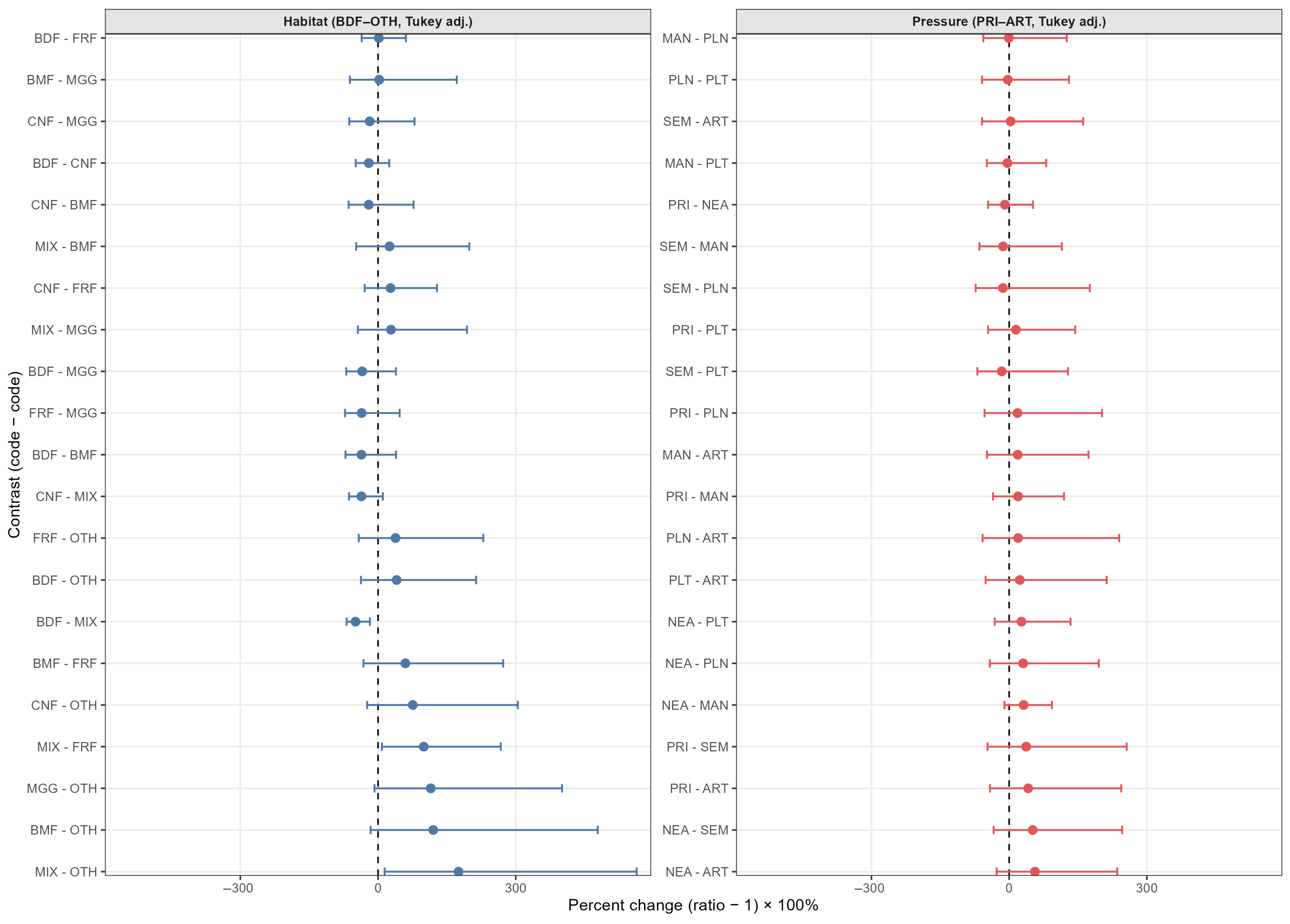 30], whereas the management intensity “pressure” framework was introduced here as a complementary categorisation specific to this study. For modelling and graphics, classes were encoded with stable three-letter codes (habitat: BDF, CNF, MIX, ALP, BMF, FRF, MGG, OTH; pressure: PRI, NEA, SEM, MAN, PLN, PLT, ART). Operationally, this pressure gradient spans from strictly protected, structurally complex stands with high volumes of dead wood and minimal direct intervention (PRI–NEA), through semi-natural and multi-use forests, where management and planting are present but stand structure remains comparatively heterogeneous (SEM–MAN–PLN), to plantation and artificial settings (PLT–ART) characterised by simplified species composition, short rotations, regular spacing, and strongly reduced amounts of dead wood and other microhabitats.