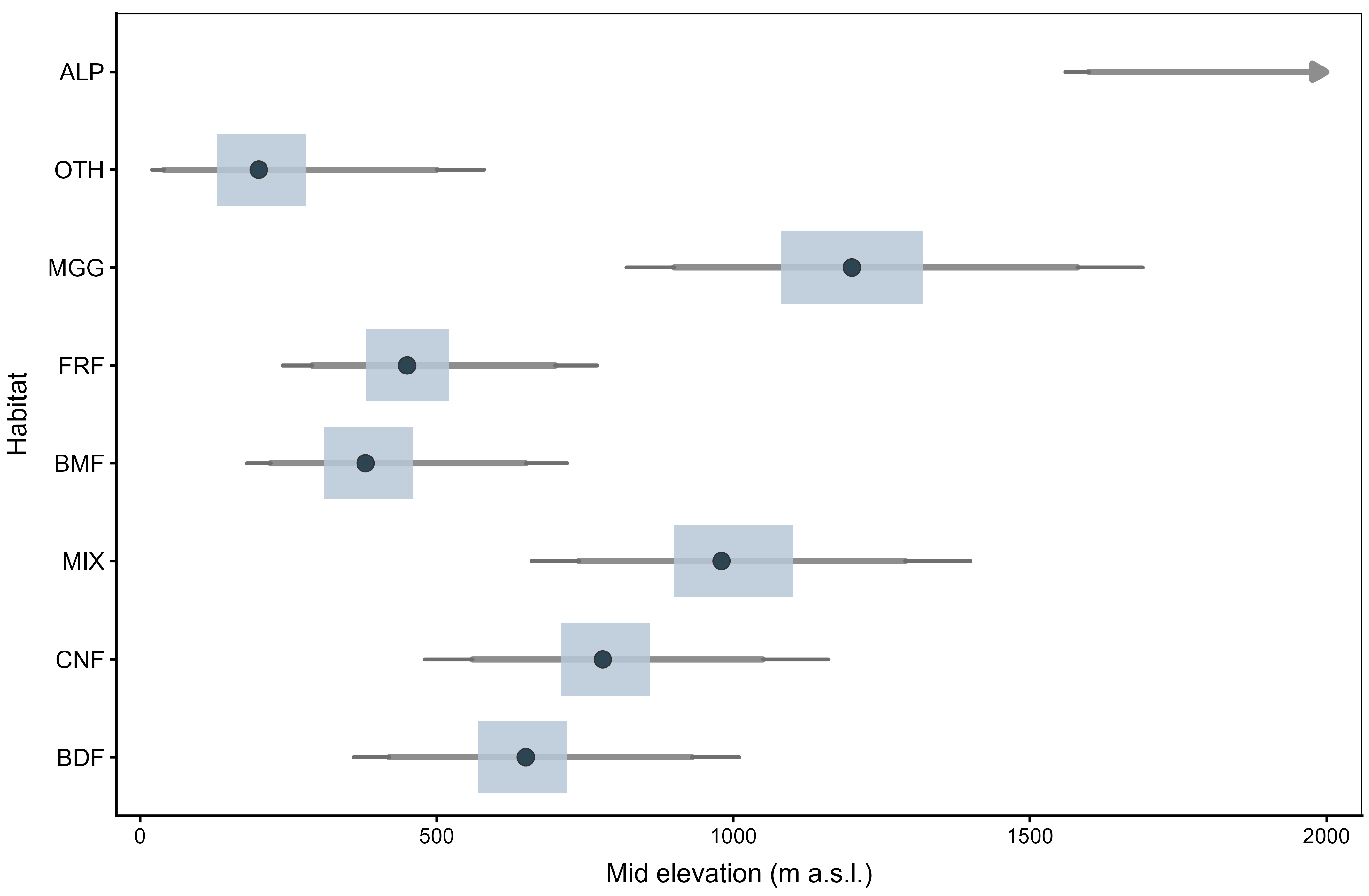 Elevation responses of Eumycetozoa intensity were analysed within the same ZTNB GAMM structure, with habitat-specific elevation smooths alongside fixed effects for and , spatial smooths, a temporal smooth , and a country random effect. For the alpine or subalpine class (ALP), a thin plate regression spline with shrinkage was used so that the elevation curve could shrink towards zero where support was sparse, while remaining estimable. Partial dependence predictions were obtained on habitat-wise elevation grids spanning the central observed range, with longitude and latitude set to their medians and interpreted as one unit of standardised effort. For each habitat, the optimum was defined as the grid point maximising the fitted curve on a dense grid (10-m step within the observed domain). The 80% tolerance was defined, within the observed elevation domain, as the narrowest interval where the predicted intensity was at least 80% of the habitat-specific maximum. Uncertainty was quantified by a parametric bootstrap from the fitted ZTNB GAMM ( coefficient draws); for each draw, the grid was re-evaluated, the optimum and the 80% tolerance were re-extracted, and 95% confidence intervals were summarised. Monotonic or flat-top curves (no interior maximum) were flagged as having no interior optimum; for these, tolerance was reported where definable and the optimum point was omitted.