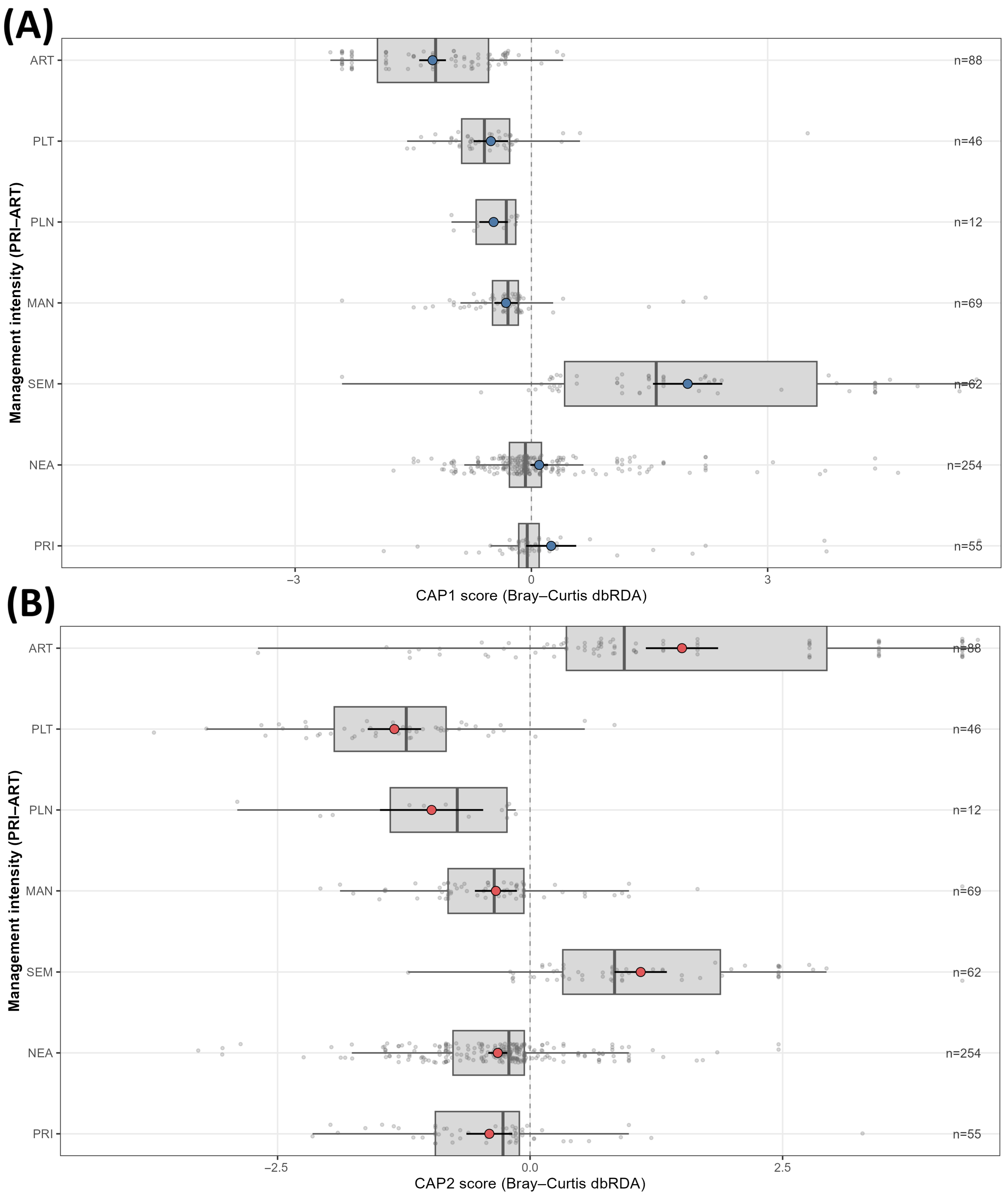 Community–environment relations were evaluated using distance-based redundancy analysis (Bray–Curtis dbRDA) implemented as a constrained analysis of principal coordinates (CAP) on a presence–absence species matrix at the analysis unit level. For management intensity, a partial dbRDA was performed with as the constraint and as the conditioning matrix. Significance was assessed with 999 permutations constrained within countries. Because analysis units are spatially structured, p values were interpreted conservatively.