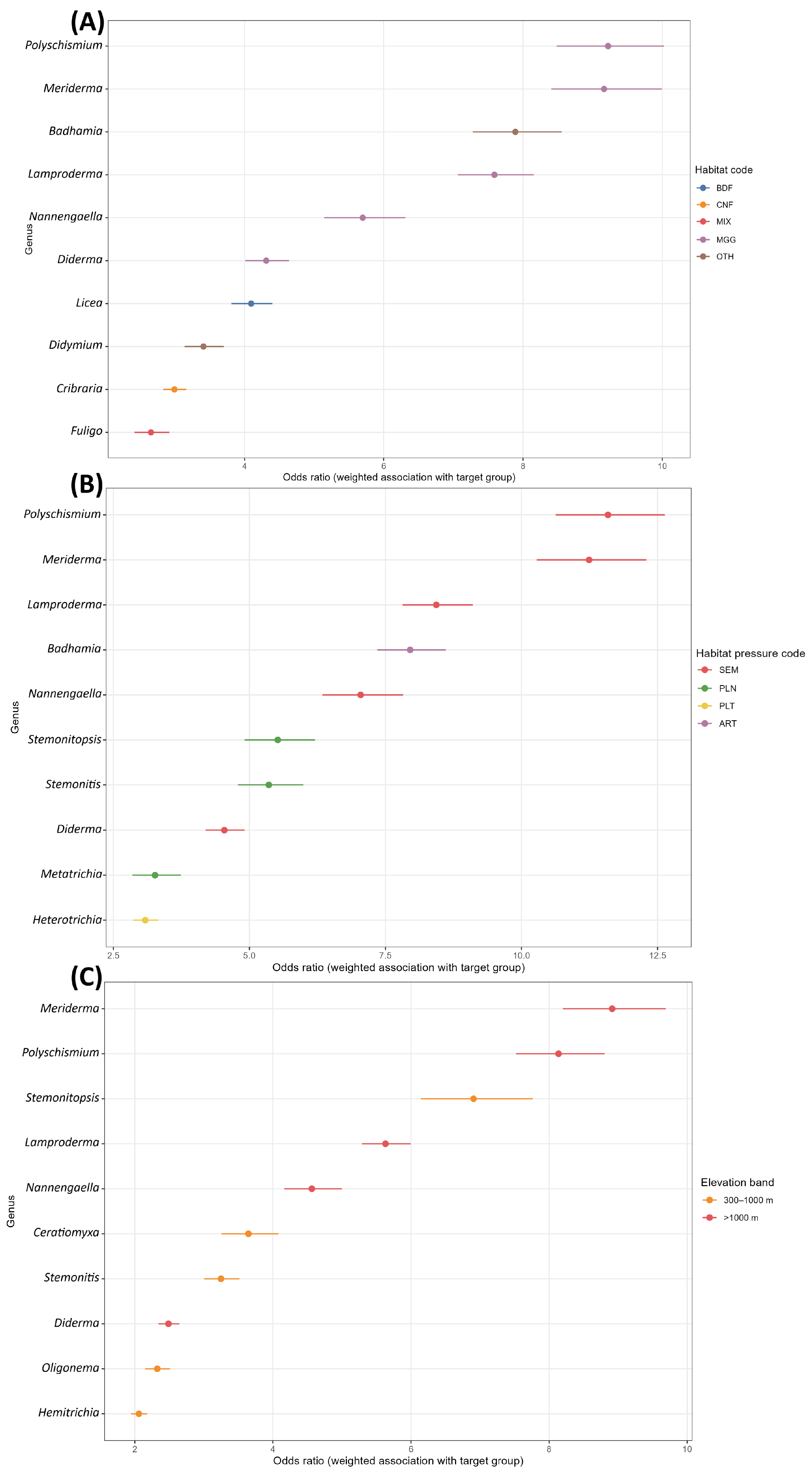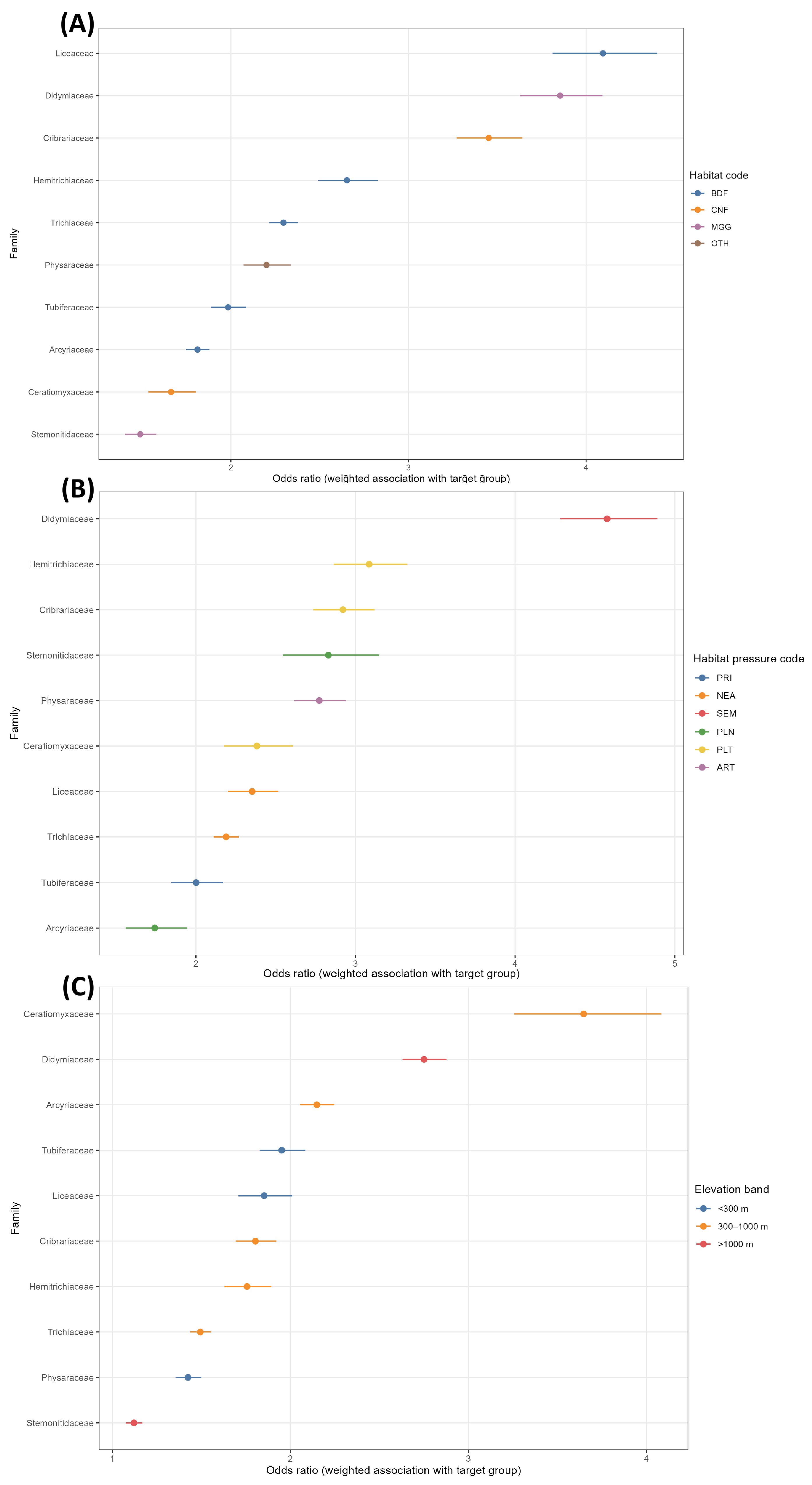 Forest habitat acted as the principal organiser of Eumycetozoa intensity. Mixed stands were higher than broadleaved baselines; riparian settings were broadly comparable, and non-forest or anthropogenic contexts were consistently lower. Elevation further modulated these differences within habitats. Management intensity influenced assemblages, but the signal was secondary and model dependent; departures from primary or old growth were modest and often statistically indistinct once effort and broad spatial structure were controlled, so management information should refine rather than replace habitat information in bioindication.