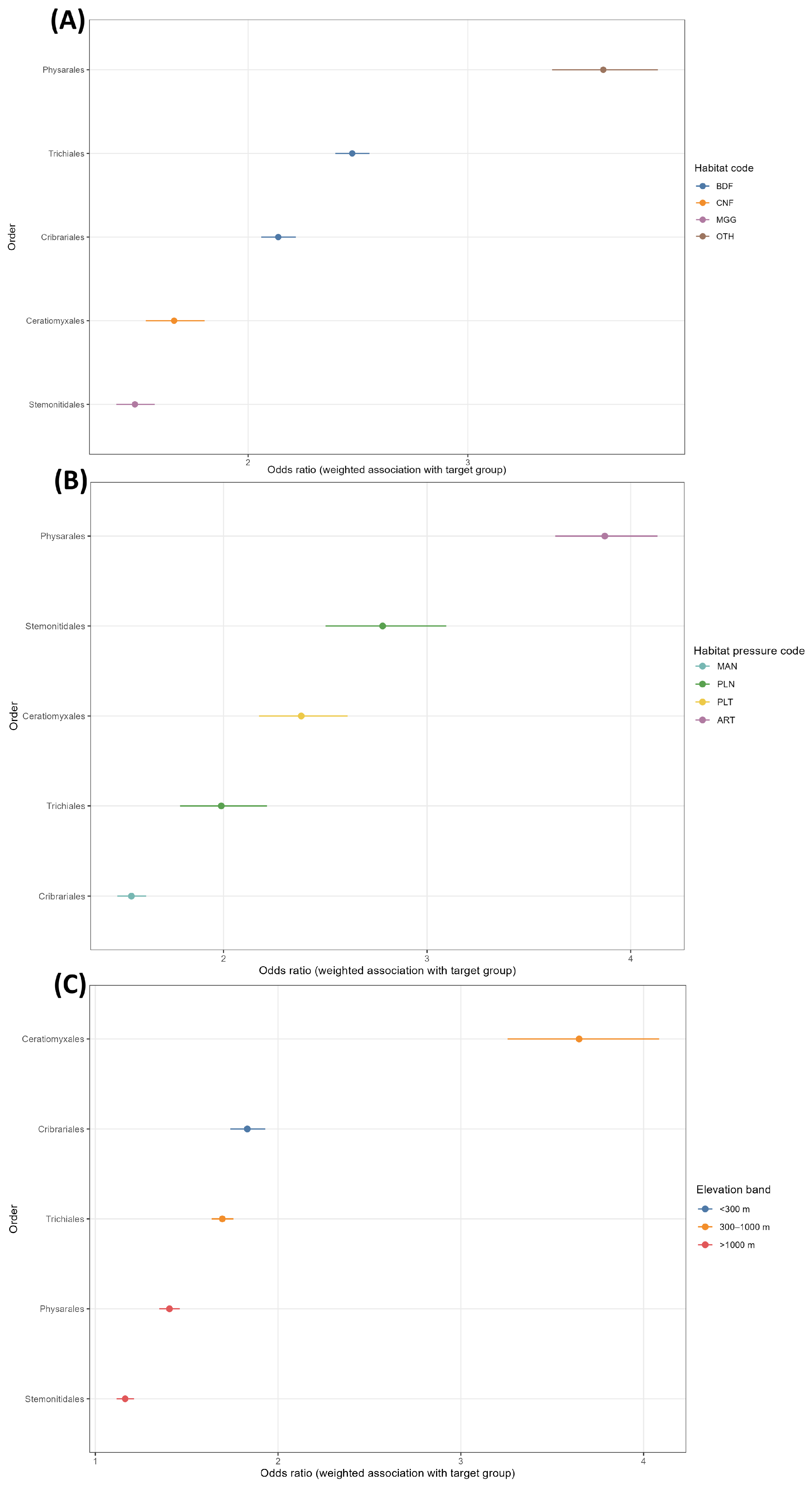 The study clarified that habitat composition was a dominant organiser of assemblages relative to management intensity once effort and broad spatial structure were considered, with elevation shaping responses in a habitat-specific manner. It yielded compact, elevation-aware indicator sets: species-level indicators were suited to fine-grained assessments where taxonomic expertise and fruiting material permit, whereas robust genus-level signals can be deployed where species identification is a bottleneck. It also provided an explicit account of generalisation: cross-validated predictions were conservatively calibrated, yet the directions of habitat and management effects remained stable across countries, an important property for transferring indicator knowledge between regions and for designing gap-filling surveys.
