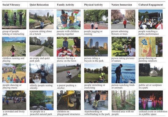 Each park activity category was operationalized through four representative activities, which served as semantic prompts for image-text matching in CLIP. The six park activity categories and their related representative activity prompts are listed below (see Figure 3 for examples of each):