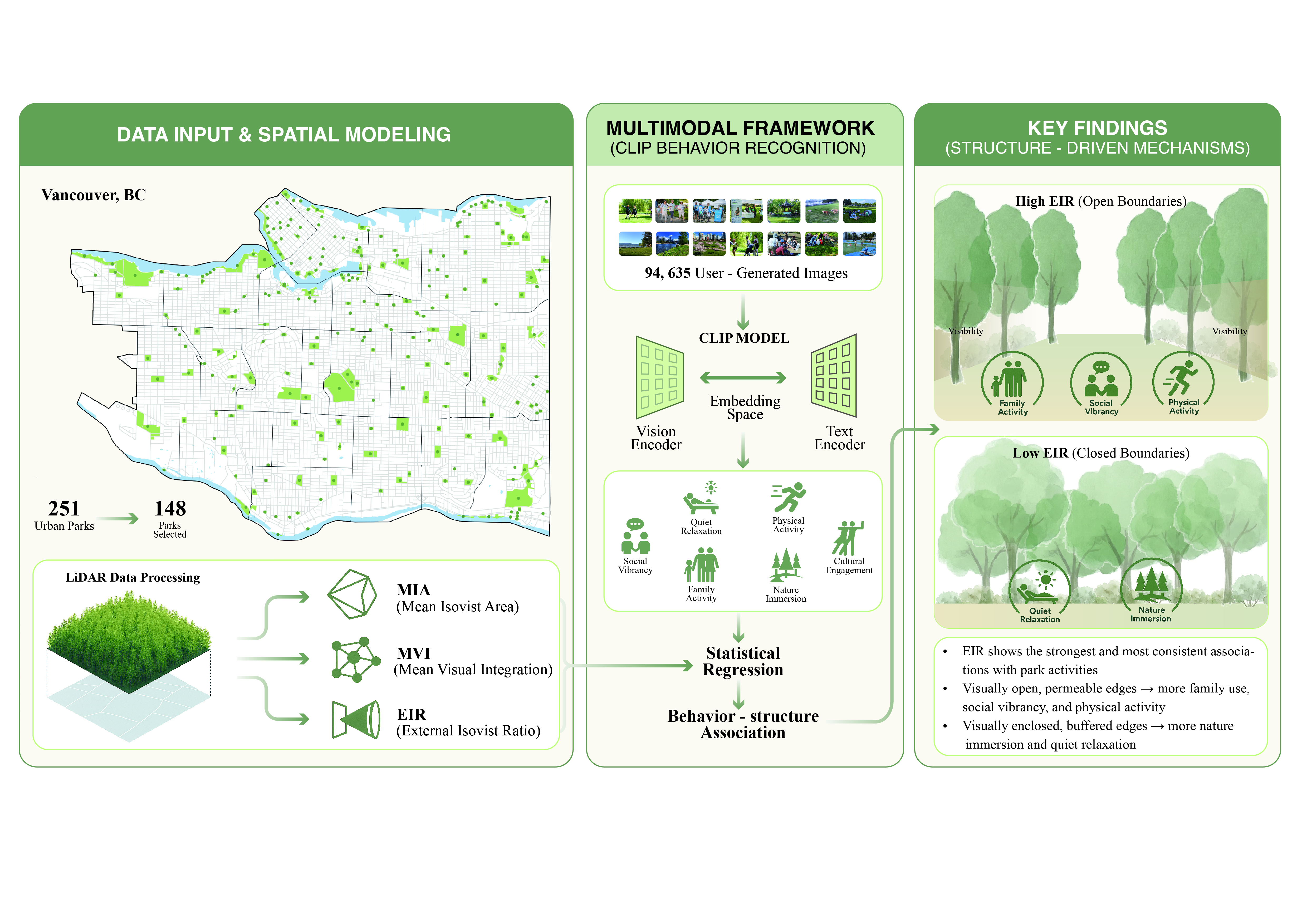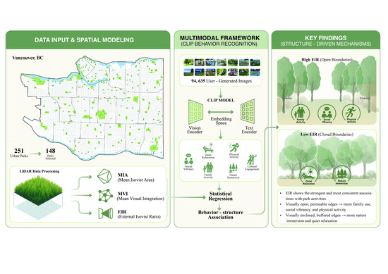 Despite increasing interest in the spatial–behavioral dynamics of UGS, several critical research gaps remain: First, while vegetation structure has been linked to the movement and perception of park users [8,9], few studies have systematically examined how visibility metrics relate to different types of user activity within urban parks [11,22]. Second, although UGIs offer a unique perspective on real-world user experiences [21,28], their semantic content remains underused in landscape behavioral research. The potential of CLIP-powered classification for large-scale behavioral analysis in UGS has not been fully utilized [22]. Third, the integration of spatial visibility modeling, such as Mean Isovist Area (MIA), Mean Visual Integration (MVI), and External Isovist Ratio (EIR), with image-derived user activity has not been explored [6,10,20]. Thus, it is difficult to assess how spatial design is linked to user engagement in urban parks. To fill these gaps, a new multimodal framework that combines LiDAR-informed space syntax metrics with CLIP-based image classification is deployed. Using 148 urban parks in Vancouver, Canada, the association between spatial visibility and user activity is examined. The study is guided by the following question: To what extent do LiDAR-derived visibility metrics (MIA, MVI, and EIR) correlate with user activity identified from large-scale user-generated images across Vancouver parks?