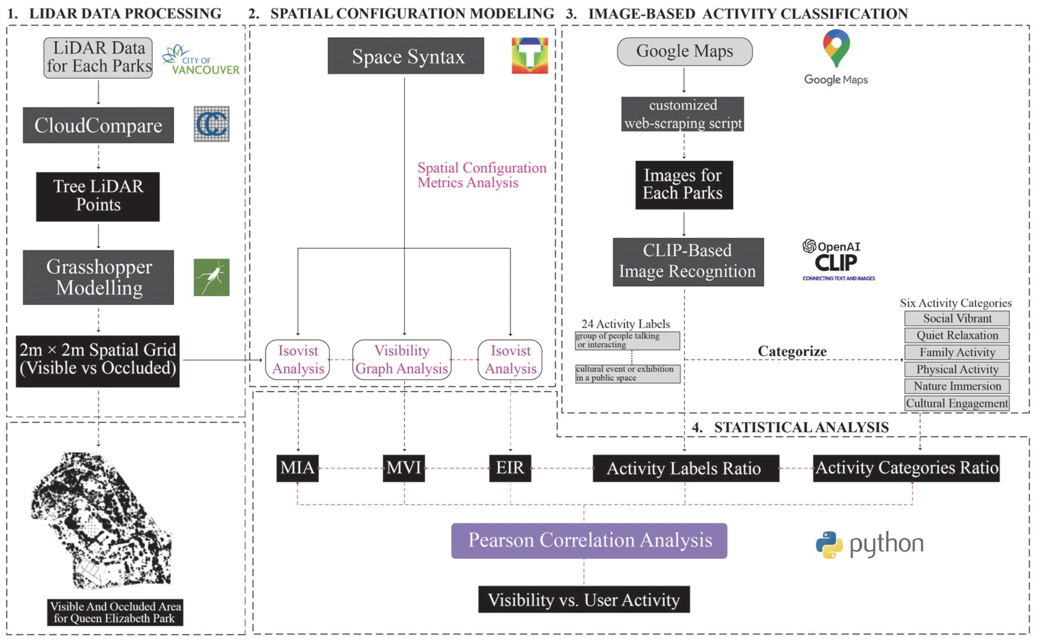 An integrated, multi-modal framework was used to explore the relationship between spatial visibility and user activity in Vancouver’s urban parks (Figure 1). Here is a summary of the several key stages: